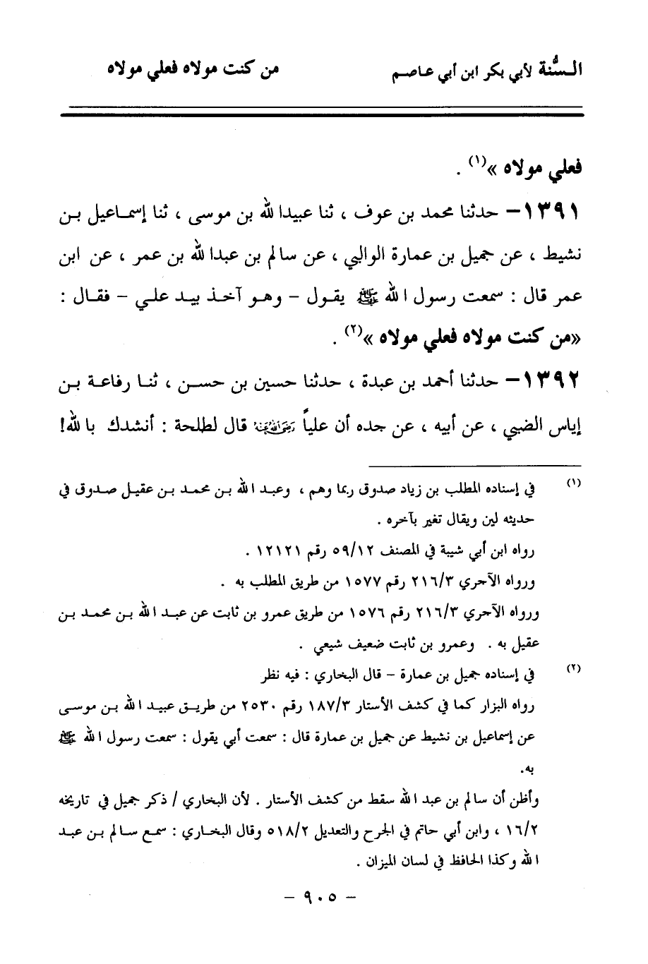 1391 - حَدَّثنا مُحَمَّدُ بْنُ عَوْفٍ، حَدَّثنا عُبَيْدُ اللهِ بْنُ مُوسَى، حَدَّثنا إِسْمَاعِيلُ بْنُ نَشِيطٍ، عَنْ جَمِيلِ بْنِ عُمَارَةَ الْوَالِبِيِّ، عَنْ سَالِمِ بْنِ عَبْدِ اللهِ بْنِ عُمَرَ، عَنِ ابْنِ عُمَرَ، قَالَ: سَمِعْتُ رَسُولَ اللهِ صَلى الله عَلَيهِ وسَلمَ يَقُولُ، وَهُوَ آخُذٌ بِيَدِ عَلِيٍّ، فَقَالَ: مَنْ كُنْتُ مَوْلاَهُ, فَعَلِيٌّ مَوْلاَهُ.