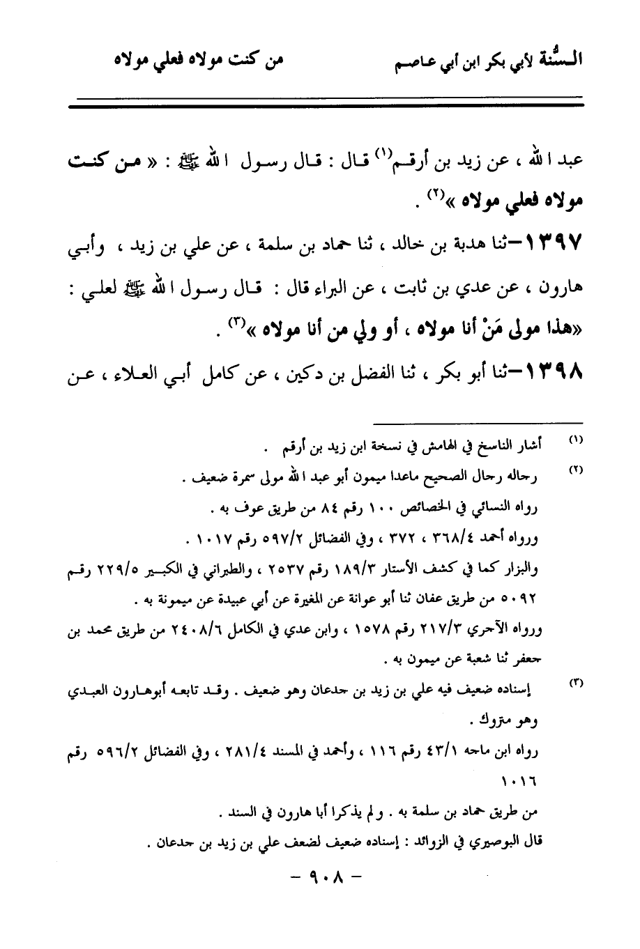 1398 - حَدَّثنا أَبُو بَكْرٍ، حَدَّثنا الْفَضْلُ بْنُ دُكَيْنٍ، عَنْ كَامِلٍ, أَبِي الْعَلاَءِ، عَنْ حَبِيبِ بْنِ أَبِي ثَابِتٍ، عَنْ زَيْدِ بْنِ أَرْقَمَ، عَنِ النَّبِيِّ صَلى الله عَلَيهِ وسَلمَ قَالَ: مَنْ كُنْتُ مَوْلاَهُ, فَعَلِيٌّ مَوْلاَهُ.