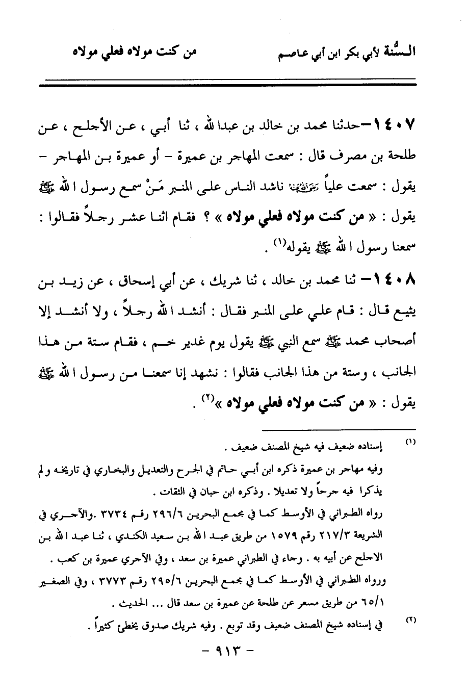 1407 - حَدَّثنا مُحَمَّدُ بْنُ خَالِدِ بْنِ عَبْدِ اللهِ، حَدَّثنا أَبِي، عَنِ الأَجْلَحِ، عَنْ طَلْحَةَ بْنِ مُصَرِّفٍ، قَالَ: سَمِعْتُ الْمُهَاجِرَ بْنَ عَمِيرَةَ, أَوْ عَمِيرَةَ بْنَ الْمُهَاجِرِ، يَقُولُ: سَمِعْتُ عَلِيًّا رَضِيَ اللهُ عَنْهُ، نَاشَدَ النَّاسَ عَلَى الْمِنْبَرِ: مَنْ سَمِعَ رَسُولَ اللهِ صَلى الله عَلَيهِ وسَلمَ يَقُولُ: مَنْ كُنْتُ مَوْلاَهُ, فَعَلِيٌّ مَوْلاَهُ؟ فَقَامَ اثْنَا عَشَرَ رَجُلاً، فَقَالُوا: سَمِعْنَا رَسُولَ اللهِ صَلى الله عَلَيهِ وسَلمَ يَقُولُهُ.