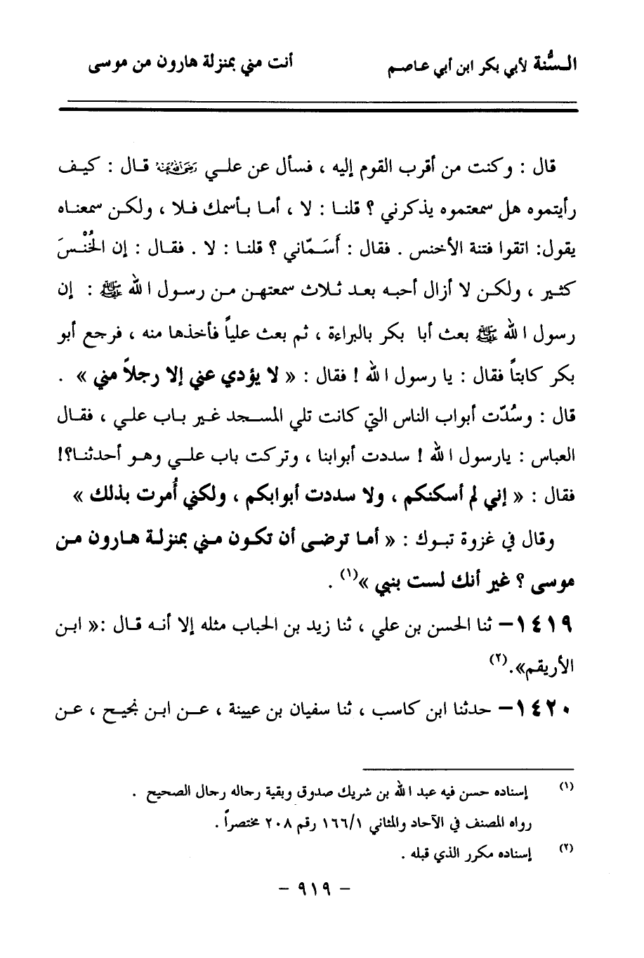 وَقَالَ فِي غَزْوَةِ تَبُوكَ: أَمَا تَرْضَى أَنْ تَكُونَ مِنِّي بِمَنْزِلَةِ هَارُونَ مِنْ مُوسَى، غَيْرَ أَنَّكَ لَسْتَ بِنَبِيٍّ.