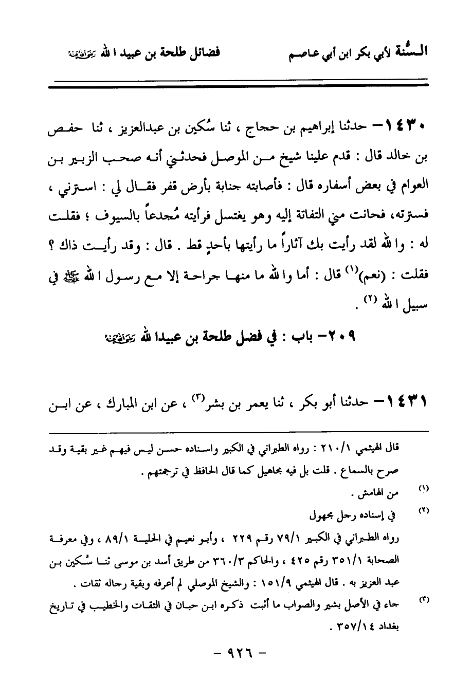 1430 - حَدَّثنا إِبْرَاهِيمُ بْنُ حَجَّاجٍ، حَدَّثنا سُكَيْنُ بْنُ عَبْدِ الْعَزِيزِ، حَدَّثنا حَفْصُ بْنُ خَالِدٍ، قَالَ: قَدِمَ عَلَيْنَا شَيْخٌ مِنَ الْمَوْصِلِ، فَحَدَّثَنِي أَنَّهُ صَحِبَ الزُّبَيْرَ بْنَ الْعَوَّامِ فِي بَعْضِ أَسْفَارِهِ، قَالَ: فَأَصَابَتْهُ جَنَابَةٌ بِأَرْضٍ قَفْرٍ، فَقَالَ لِي: اسْتُرْنِي، فَسَتَرْتُهُ، فَحَانَتْ مِنِّي الْتِفَاتَةٌ إِلَيْهِ وَهُوَ يَغْتَسِلُ، فَرَأَيْتُهُ مُجَدَّعًا بِالسُّيُوفِ، فَقُلْتُ لَهُ: وَاللهِ لَقَدْ رَأَيْتُ بِكَ آثَارًا مَا رَأَيْتُهَا بِأَحَدٍ قَطُّ، قَالَ: وَقَدْ رَأَيْتَ ذَاكَ؟ فَقُلْتُ: نَعَمْ، قَالَ: أَمَا وَاللهِ مَا مِنْهَا جِرَاحَةٌ إِلاَّ مَعَ رَسُولِ اللهِ صَلى الله عَلَيهِ وسَلمَ فِي سَبِيلِ اللهِ.