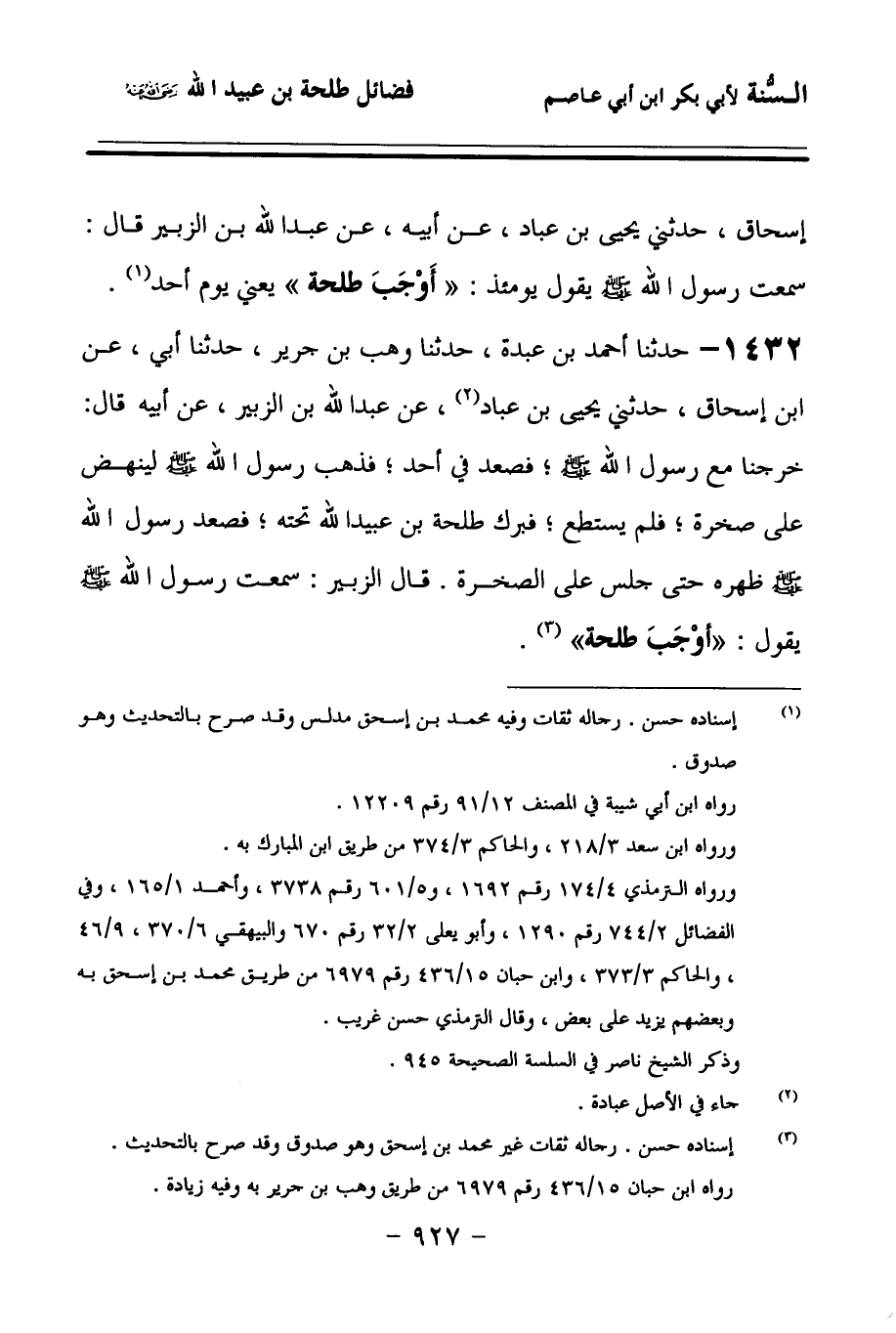 1432 - حَدَّثنا أَحْمَدُ بْنُ عَبْدَةَ، حَدَّثنا وَهْبُ بْنُ جَرِيرٍ، حَدَّثنا أَبِي، عَنِ ابْنِ إِسْحَاقَ، حَدَّثَنِي يَحْيَى بْنُ عَبَّادٍ، عَنْ عَبْدِ اللهِ بْنِ الزُّبَيْرِ، عَنْ أَبِيهِ، قَالَ: خَرَجْنَا مَعَ رَسُولِ اللهِ صَلى الله عَلَيهِ وسَلمَ، فَصَعِدَ فِي أُحُدٍ، فَذَهَبَ رَسُولُ اللهِ صَلى الله عَلَيهِ وسَلمَ لِيَنْهَضَ عَلَى صَخْرَةٍ, فَلَمْ يَسْتَطِعْ، فَبَرَكَ طَلْحَةُ بْنُ عُبَيْدِ اللهِ تَحْتَهُ، فَصَعِدَ رَسُولُ اللهِ صَلى الله عَلَيهِ وسَلمَ ظَهْرَهُ, حَتَّى جَلَسَ عَلَى الصَّخْرَةِ، قَالَ الزُّبَيْرُ: سَمِعْتُ رَسُولَ اللهِ صَلى الله عَلَيهِ وسَلمَ يَقُولُ: أَوْجَبَ طَلْحَةُ.