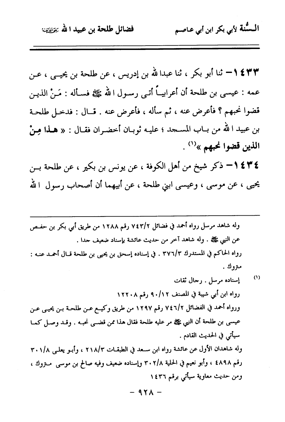 1433 - حَدَّثنا أَبُو بَكْرٍ، حَدَّثنا عَبْدُ اللهِ بْنُ إِدْرِيسَ، عَنْ طَلْحَةَ بْنِ يَحْيَى، عَنْ عَمِّهِ عِيسَى بْنِ طَلْحَةَ، أَنَّ أَعْرَابِيًّا أَتَى رَسُولَ اللهِ صَلى الله عَلَيهِ وسَلمَ، فَسَأَلَهُ مَنِ الَّذِينَ قَضَوْا نَحْبَهُمْ؟ فَأَعْرَضَ عَنْهُ، ثُمَّ سَأَلَهُ, فَأَعْرَضَ عَنْهُ، قَالَ: فَدَخَلَ طَلْحَةُ بْنُ عُبَيْدِ اللهِ مِنْ بَابِ الْمَسْجِدِ, عَلَيْهِ ثَوْبَانِ أَخْضَرَانِ، فَقَالَ: هَذَا مِنَ الَّذِينَ قَضَوْا نَحْبَهُمْ.