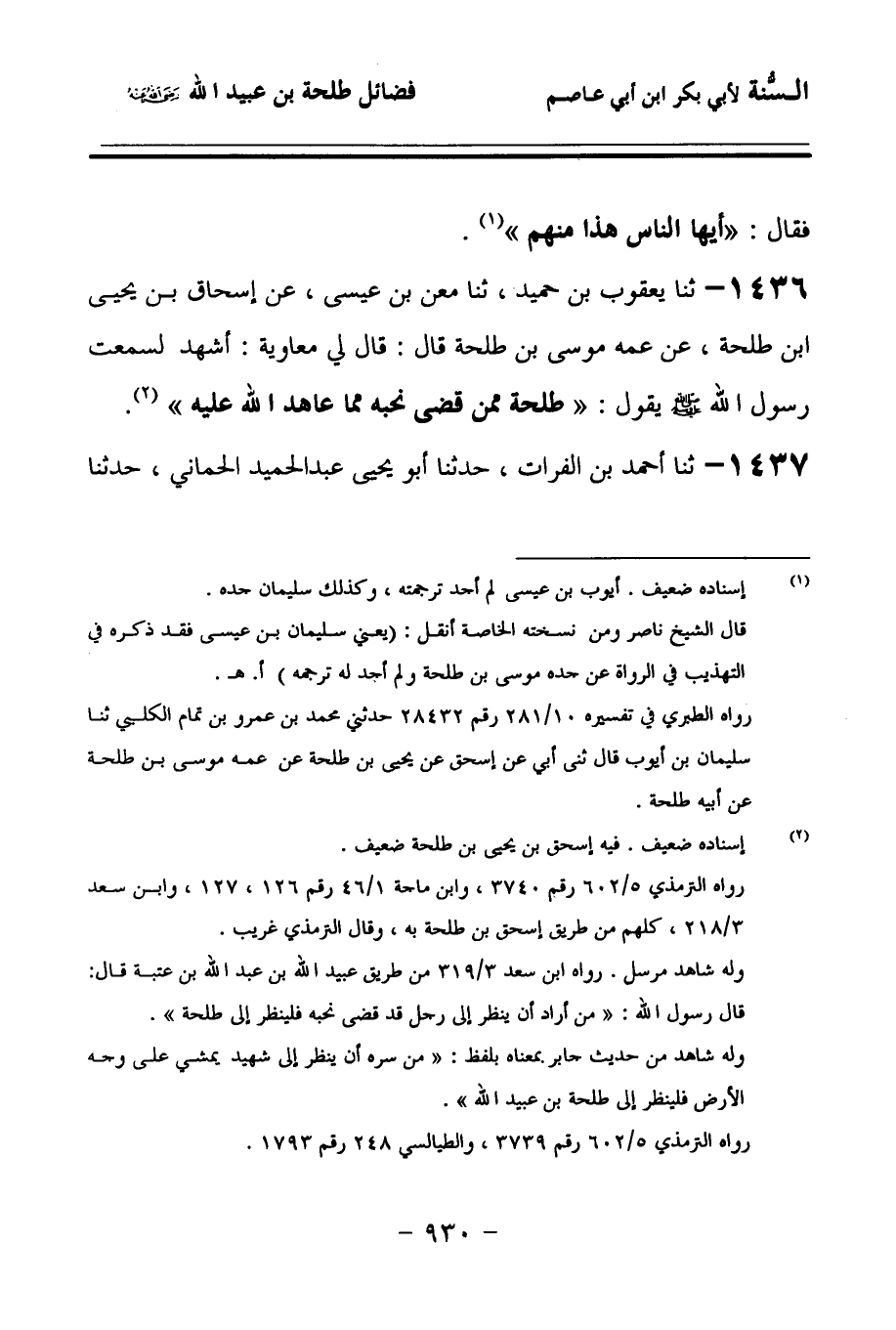 1437 - حَدَّثنا أَحْمَدُ بْنُ الْفُرَاتِ، حَدَّثنا أَبُو يَحْيَى عَبْدُ الْحَمِيدِ الْحِمَّانِيُّ، حَدَّثنا إِسْحَاقُ بْنُ يَحْيَى بْنِ طَلْحَةَ، عَنْ عَمِّهِ عِيسَى بْنِ طَلْحَةَ، عَنْ مُعَاوِيَةَ، قَالَ: سَمِعْتُ رَسُولَ اللهِ صَلى الله عَلَيهِ وسَلمَ يَقُولُ: طَلْحَةُ مِمَّنْ قَضَى نَحْبَهُ.