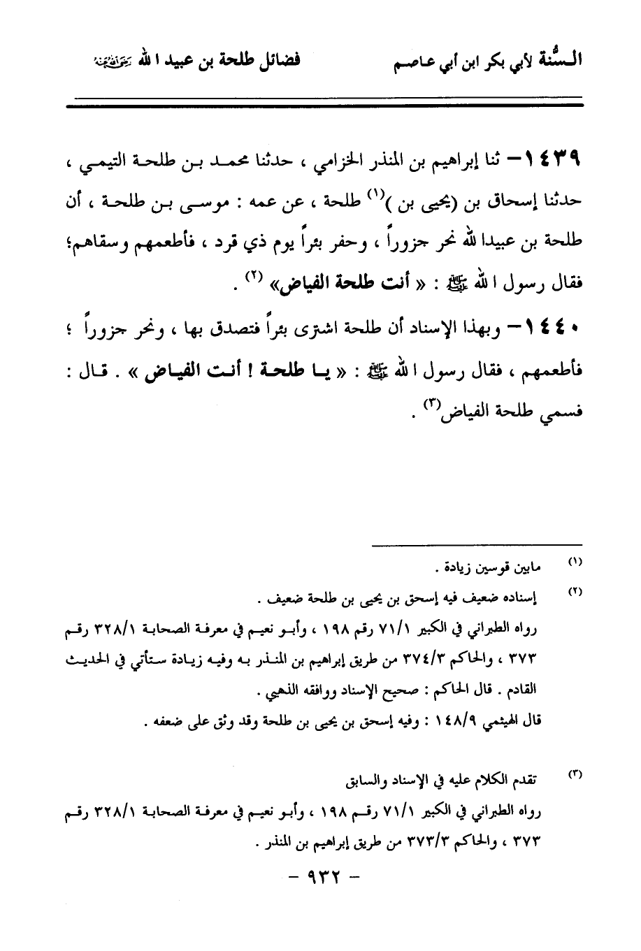 1439 - حَدَّثنا إِبْرَاهِيمُ بْنُ الْمُنْذِرِ الْحِزَامِيُّ (1)، حَدَّثنا مُحَمَّدُ بْنُ طَلْحَةَ التَّيْمِيُّ، حَدَّثنا إِسْحَاقُ بْنُ (يحيى بن) طَلْحَةَ، عَنْ عَمِّهِ مُوسَى بْنِ طَلْحَةَ، أَنَّ طَلْحَةَ بْنَ عُبَيْدِ اللهِ نَحَرَ جَزُورًا، وَحَفَرَ بِئْرًا يَوْمَ ذِي قَرَدٍ، فَأَطْعَمَهُمْ وَسَقَاهُمْ، فَقَالَ رَسُولُ اللهِ صَلى الله عَلَيهِ وسَلمَ: أَنْتَ طَلْحَةُ الْفَيَّاضُ.