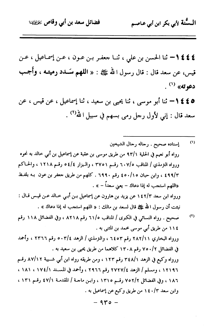 1444 - حَدَّثنا الْحَسَنُ بْنُ عَلِيٍّ، حَدَّثنا جَعْفَرُ بْنُ عَوْنٍ، عَنْ إِسْمَاعِيلَ، عَنْ قَيْسٍ، عَنْ سَعْدٍ، قَالَ: قَالَ رَسُولُ اللهِ صَلى الله عَلَيهِ وسَلمَ: اللهُمَّ سَدِّدَ رَمْيَتَهُ، وَأَجِبْ دَعَوْتَهُ.