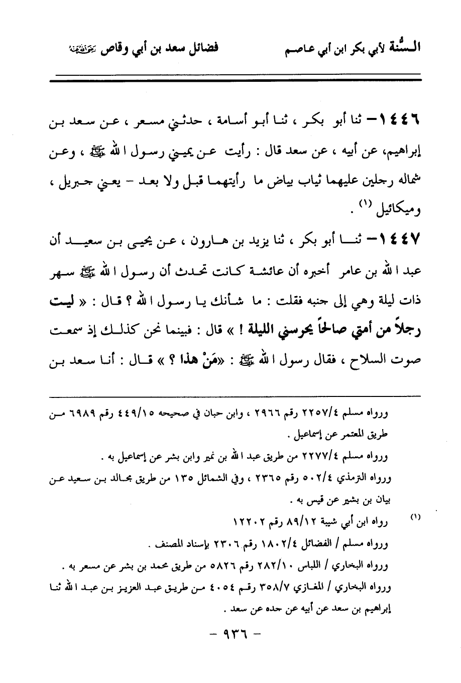 1446 - حَدَّثنا أَبُو بَكْرٍ، حَدَّثنا أَبُو أُسَامَةَ، حَدَّثَنِي مِسْعَرٌ، عَنْ سَعْدِ بْنِ إِبْرَاهِيمَ، عَنْ أَبِيهِ، عَنْ سَعْدٍ، قَالَ: رَأَيْتُ عَنْ يَمِينِي رَسُولِ اللهِ صَلى الله عَلَيهِ وسَلمَ, وَعَنْ شِمَالِهِ رَجُلَيْنِ عَلَيْهِمَا ثِيَابٌ بَيَاضٌ مَا رَأَيْتُهُمَا قَبْلُ وَلاَ بَعْدُ, يَعْنِي جِبْرِيلَ, وَمِيكَائِيلَ.