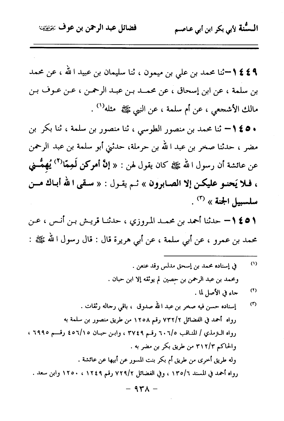 1450 - حَدَّثنا مُحَمَّدُ بْنُ مَنْصُورٍ الطُّوسِيُّ، حَدَّثنا مَنْصُورُ بْنُ سَلَمَةَ، حَدَّثنا بَكْرُ بْنُ مُضَرَ، حَدَّثنا صَخْرُ بْنُ عَبْدِ اللهِ بْنِ حَرْمَلَةَ، حَدَّثَنِي أَبُو سَلَمَةَ بْنُ عَبْدِ الرَّحْمَنِ، عَنْ عَائِشَةَ، أَنَّ رَسُولَ اللهِ صَلى الله عَلَيهِ وسَلمَ كَانَ يَقُولُ لَهُنَّ: إِنَّ أَمْرَكُنَّ لَمِمَّا يُهِمُّنِي، فَلاَ يَحْنُو عَلَيْكُنَّ إِلاَّ الصَّابِرُونَ، ثُمَّ يَقُولُ: سَقَى اللهُ أَبَاكَ مِنْ سَلْسَبِيلِ الْجَنَّةِ.
