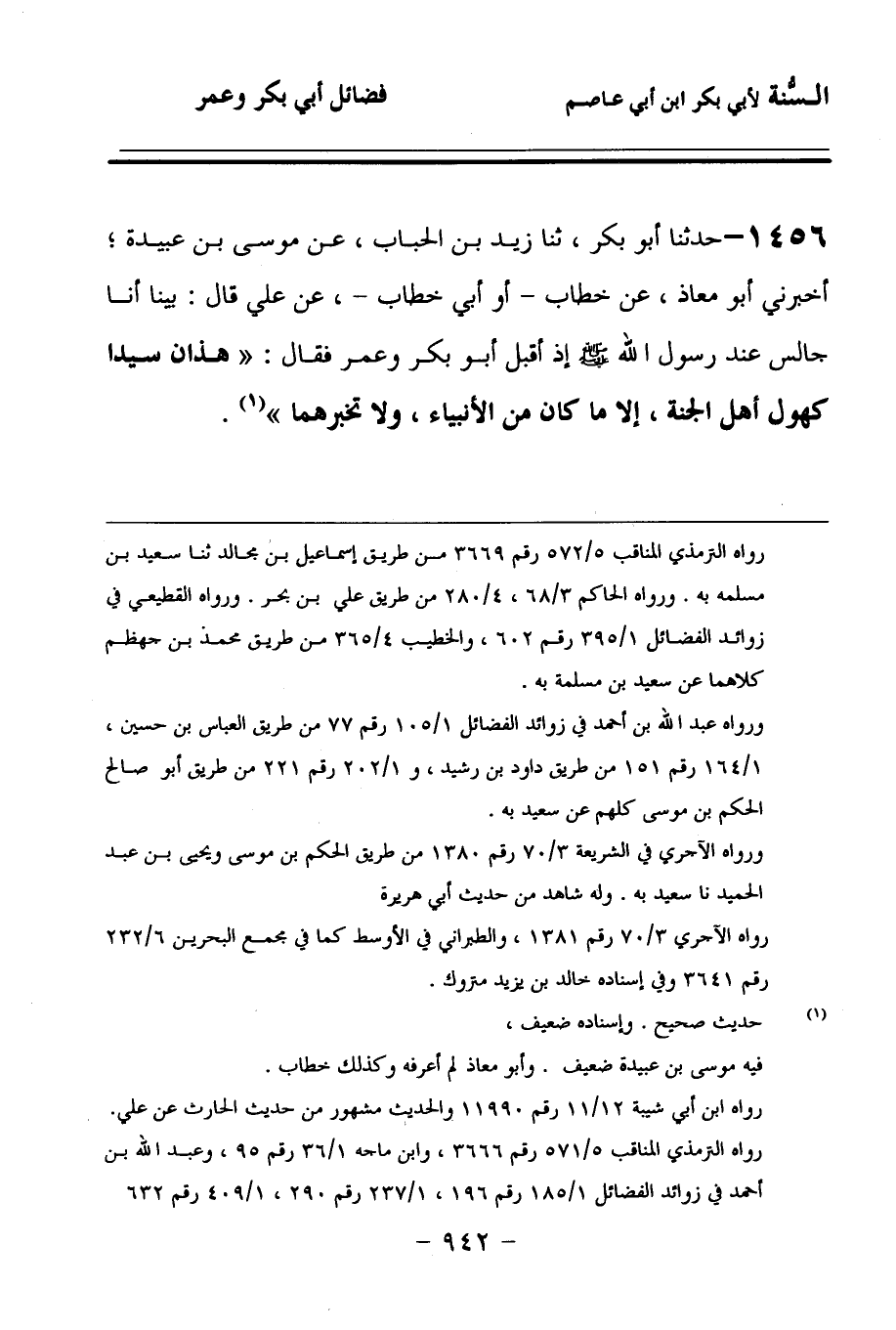 1456 - حَدَّثنا أَبُو بَكْرٍ، حَدَّثنا زَيْدُ بْنُ الْحُبَابِ، عَنْ مُوسَى بْنِ عُبَيْدَةَ، أَخْبَرَنِي أَبُو مُعَاذٍ، عَنْ خَطَّابٍ, أَوْ أَبِي خَطَّابٍ، عَنْ عَلِيٍّ، قَالَ: بَيْنَا أَنَا جَالِسٌ عِنْدَ رَسُولِ اللهِ صَلى الله عَلَيهِ وسَلمَ, إِذْ أَقْبَلَ أَبُو بَكْرٍ, وَعُمَرُ، فَقَالَ: هَذَانِ سَيِّدَا كُهُولِ أَهْلِ الْجَنَّةِ، إِلاَّ مَا كَانَ مِنَ الأَنْبِيَاءِ، وَلاَ تُخْبِرْهُمَا.