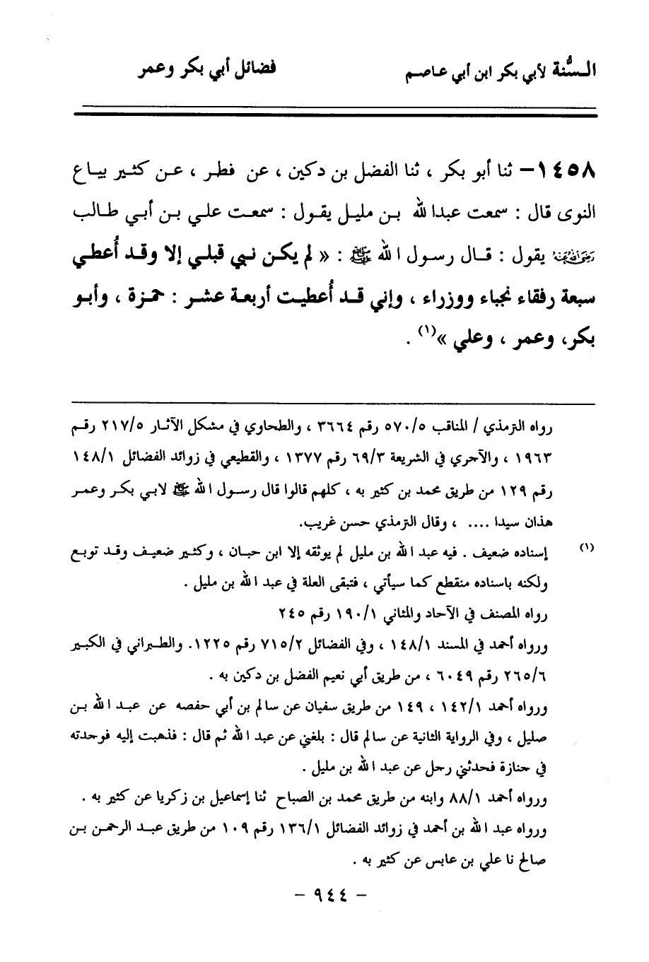 1458 - حَدَّثنا أَبُو بَكْرٍ، حَدَّثنا الْفَضْلُ بْنُ دُكَيْنٍ، عَنْ فِطْرٍ، عَنْ كَثِيرٍ، بَيَّاعِ النَّوَى، قَالَ: سَمِعْتُ عَبْدَ اللهِ بْنَ مُلَيْلٍ يَقُولُ: سَمِعْتُ عَلِيَّ بْنَ أَبِي طَالِبٍ رَضِيَ اللهُ عَنْهُ يَقُولُ: قَالَ رَسُولُ اللهِ صَلى الله عَلَيهِ وسَلمَ: لَمْ يَكُنْ نَبِيٌّ قَبْلِي, إِلاَّ وَقَدْ أُعْطِيَ سَبْعَةَ رُفَقَاءَ نُجَبَاءَ وَوُزَرَاءَ، وَإِنِّي قَدْ أُعْطِيتُ أَرْبَعَةَ عَشَرَ: حَمْزَةُ، وَأَبُو بَكْرٍ، وَعُمَرُ، وَعَلِيٌّ.