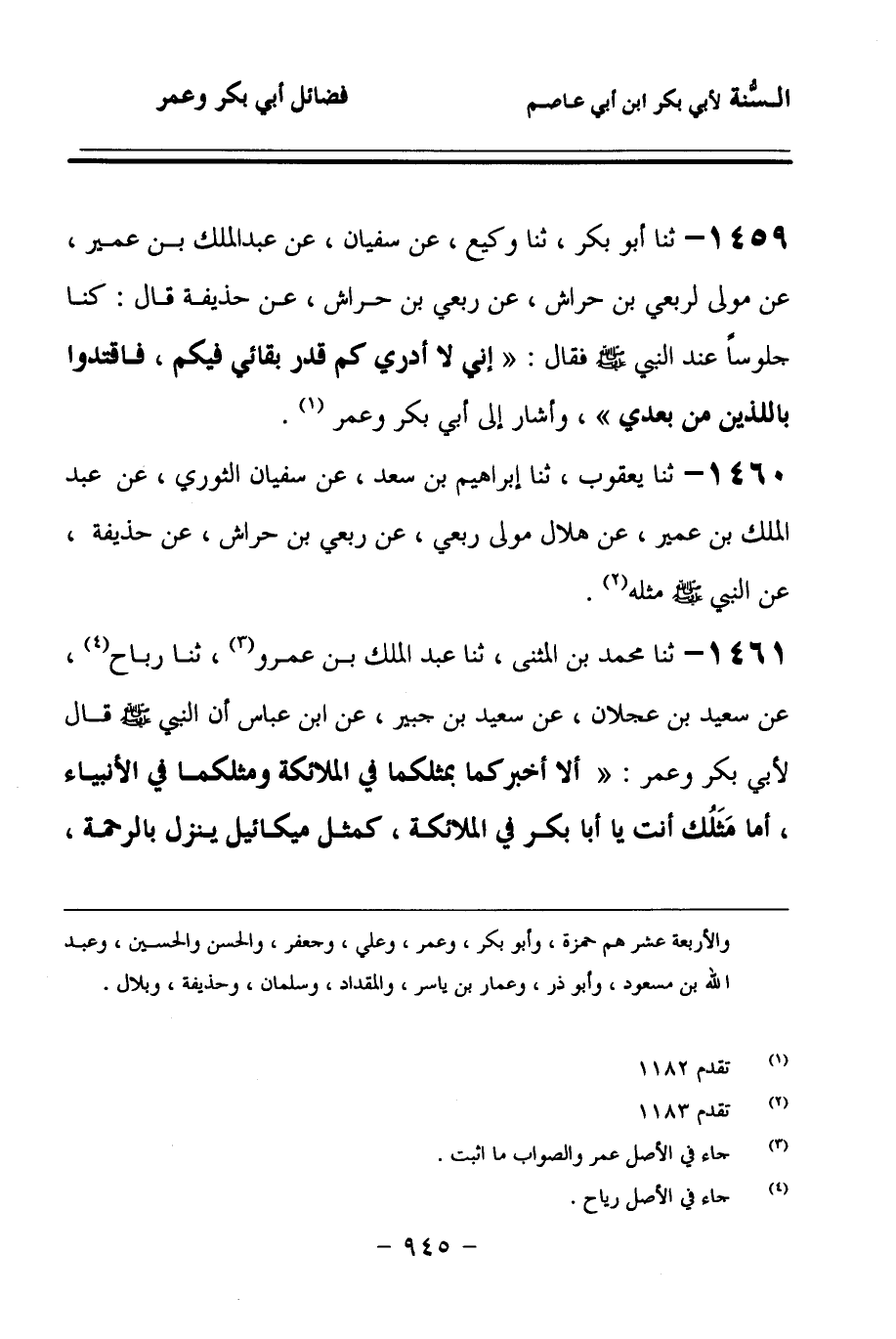 1459 - حَدَّثنا أَبُو بَكْرٍ، حَدَّثنا وَكِيعٌ، عَنْ سُفْيَانَ، عَنْ عَبْدِ الْمَلِكِ بْنِ عُمَيْرٍ، عَنْ مَوْلًى لِرِبْعِيِّ بْنِ حِرَاشٍ، عَنْ رِبْعِيِّ بْنِ حِرَاشٍ، عَنْ حُذَيْفَةَ، قَالَ: كُنَّا جُلُوسًا عِنْدَ النَّبِيِّ صَلى الله عَلَيهِ وسَلمَ، فَقَالَ: إِنِّي لاَ أَدْرِي كَمْ قَدْرُ بَقَائِي فِيكُمْ، فَاقْتَدُوا بِاللَّذَيْنِ مِنْ بَعْدِي، وَأَشَارَ إِلَى أَبِي بَكْرٍ, وَعُمَرَ.