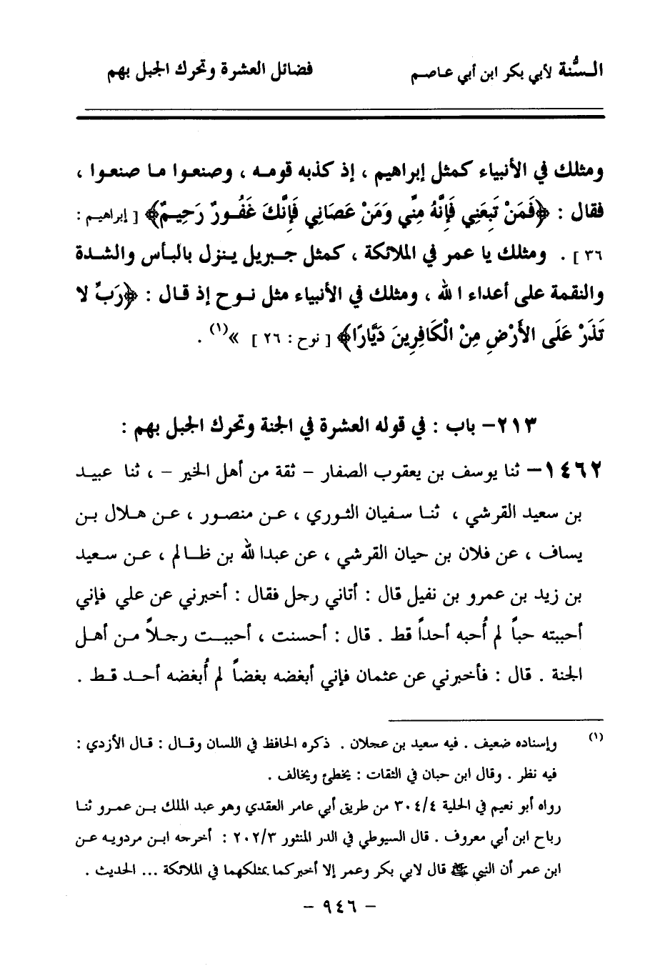 1462 - حَدَّثنا يُوسُفُ بْنُ يَعْقُوبَ الصَّفَارُ، ثِقَةٌ مِنْ أَهْلِ الْخَيْرِ، حَدَّثنا عُبَيْدُ بْنُ سَعِيدٍ الْقُرَشِيُّ، حَدَّثنا سُفْيَانُ الثَّوْرِيُّ، عَنْ مَنْصُورٍ، عَنْ هِلاَلِ بْنِ يَسَافٍ، عَنْ فُلاَنِ بْنِ حَيَّانَ الْقُرَشِيِّ، عَنْ عَبْدِ اللهِ بْنِ ظَالِمٍ، عَنْ سَعِيدِ بْنِ زَيْدِ بْنِ عَمْرِو بْنِ نُفَيْلٍ، قَالَ: أَتَانِي رَجُلٌ, فَقَالَ: أَخْبِرْنِي عَنْ عَلِيٍّ, فَإِنِّي أَحْبَبْتُهُ حُبًّا لَمْ أُحِبَّهُ أَحَدًا قَطُّ، قَالَ: أَحْسَنْتَ, أَحْبَبْتَ رَجُلاً مِنْ أَهْلِ الْجَنَّةِ، قَالَ: فَأَخْبِرْنِي عَنْ عُثْمَانَ, فَإِنَّى أَبْغَضُهُ بُغْضًا لَمْ أَبْغَضْهُ أَحَدٌ قَطُّ، قَالَ: بِئْسَ مَا صَنَعْتَ، أَبْغَضْتَ رَجُلاً مِنْ أَهْلِ الْجَنَّةِ، ثُمَّ أَنْشَأَ يُحَدِّثُ، قَالَ: تَحَرَّكَ حِرَاءٌ, فَقَالَ رَسُولُ اللهِ صَلى الله عَلَيهِ وسَلمَ: اسْكُنْ حِرَاءُ, فَإِنَّهُ لَيْسَ عَلَيْكَ إِلاَّ نَبِيٌّ، أَوْ صِدِّيقٌ، أَوْ شَهِيدٌ، قَالَ: وَعَلَيْهِ رَسُولُ اللهِ صَلى الله عَلَيهِ وسَلمَ، وَأَبُو بَكْرٍ، وَعُمَرُ، وَعُثْمَانُ، وَعَلِيٌّ، وَطَلْحَةُ، وَالزُّبَيْرُ، وَعَبْدُ الرَّحْمَنِ بْنُ عَوْفٍ، وَسَعْدُ بْنُ مَالِكٍ، قَالَ: وَلَوْ شِئْتُ أَنْ أُخْبِرَكُمْ بِالْعَاشِرِ أَخْبَرْتُكُمْ، يَعْنِي نَفْسَهُ.