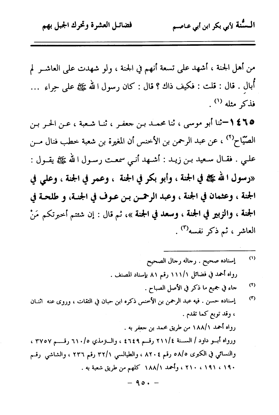 1465 - حَدَّثنا أَبُو مُوسَى، حَدَّثنا مُحَمَّدُ بْنُ جَعْفَرٍ، حَدَّثنا شُعْبَةُ، عَنِ الْحُرِّ بْنِ الصَّيَّاحِ، عَنْ عَبْدِ الرَّحْمَنِ بْنِ الأَخْنَسِ، أَنَّ الْمُغِيرَةَ بْنَ شُعْبَةَ خَطَبَ, فَنَالَ مِنْ عَلِيٍّ، فَقَالَ سَعِيدُ بْنُ زَيْدٍ: أَشْهَدُ أَنِّي سَمِعْتُ رَسُولَ اللهِ صَلى الله عَلَيهِ وسَلمَ يَقُولُ: رَسُولُ اللهِ صَلى الله عَلَيهِ وسَلمَ فِي الْجَنَّةِ، وَأَبُو بَكْرٍ فِي الْجَنَّةِ، وَعُمَرُ فِي الْجَنَّةِ، وَعَلِيٌّ فِي الْجَنَّةِ، وَعُثْمَانُ فِي الْجَنَّةِ، وَعَبْدُ الرَّحْمَنِ بن عوف فِي الْجَنَّةِ، وَطَلْحَةُ فِي الْجَنَّةِ، وَالزُّبَيْرُ فِي الْجَنَّةِ، وَسَعْدٌ فِي الْجَنَّةِ، ثُمَّ قَالَ: إِنْ شِئْتُمْ أَخْبَرْتُكُمْ مَنِ الْعَاشِرُ، ثُمَّ ذَكَرَ نَفْسَهُ.