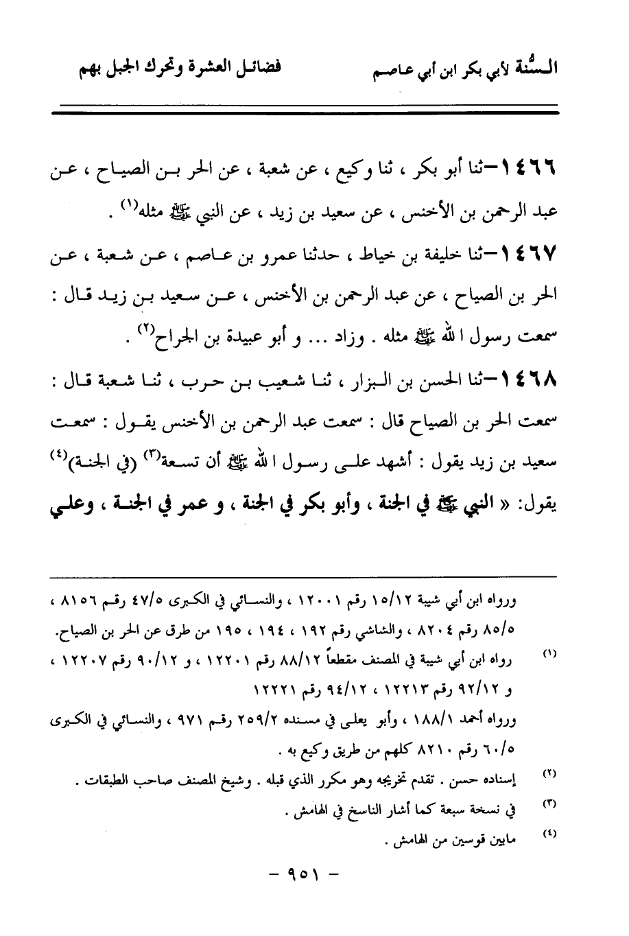1468 - حَدَّثنا الْحَسَنُ بْنُ الْبَزَّارِ، حَدَّثنا شُعَيْبُ بْنُ حَرْبٍ، حَدَّثنا شُعْبَةُ، قَالَ: سَمِعْتُ الْحُرَّ بْنَ الصَّيَّاحِ، قَالَ: سَمِعْتُ عَبْدَ الرَّحْمَنِ بْنَ الأَخْنَسِ، يَقُولُ: سَمِعْتُ سَعِيدَ بْنَ زَيْدٍ، يَقُولُ: أَشْهَدُ عَلَى رَسُولِ اللهِ صَلى الله عَلَيهِ وسَلمَ أَنَّ تِسْعَةً فِي الْجَنَّةِ، يَقُولُ: النَّبِيُّ صَلى الله عَلَيهِ وسَلمَ فِي الْجَنَّةِ، وَأَبُو بَكْرٍ فِي الْجَنَّةِ، وَعُمَرُ فِي الْجَنَّةِ، وَعَلِيٌّ فِي الْجَنَّةِ، وَطَلْحَةُ فِي الْجَنَّةِ، وَالزُّبَيْرُ فِي الْجَنَّةِ، وَعَبْدُ الرَّحْمَنِ بْنُ عَوْفٍ فِي الْجَنَّةِ، وَسَعْدٌ فِي الْجَنَّةِ، وَلَوْ شِئْتُ أَنْ أُسَمِّيَ الْعَاشِرَ لَسَمَّيْتُ.