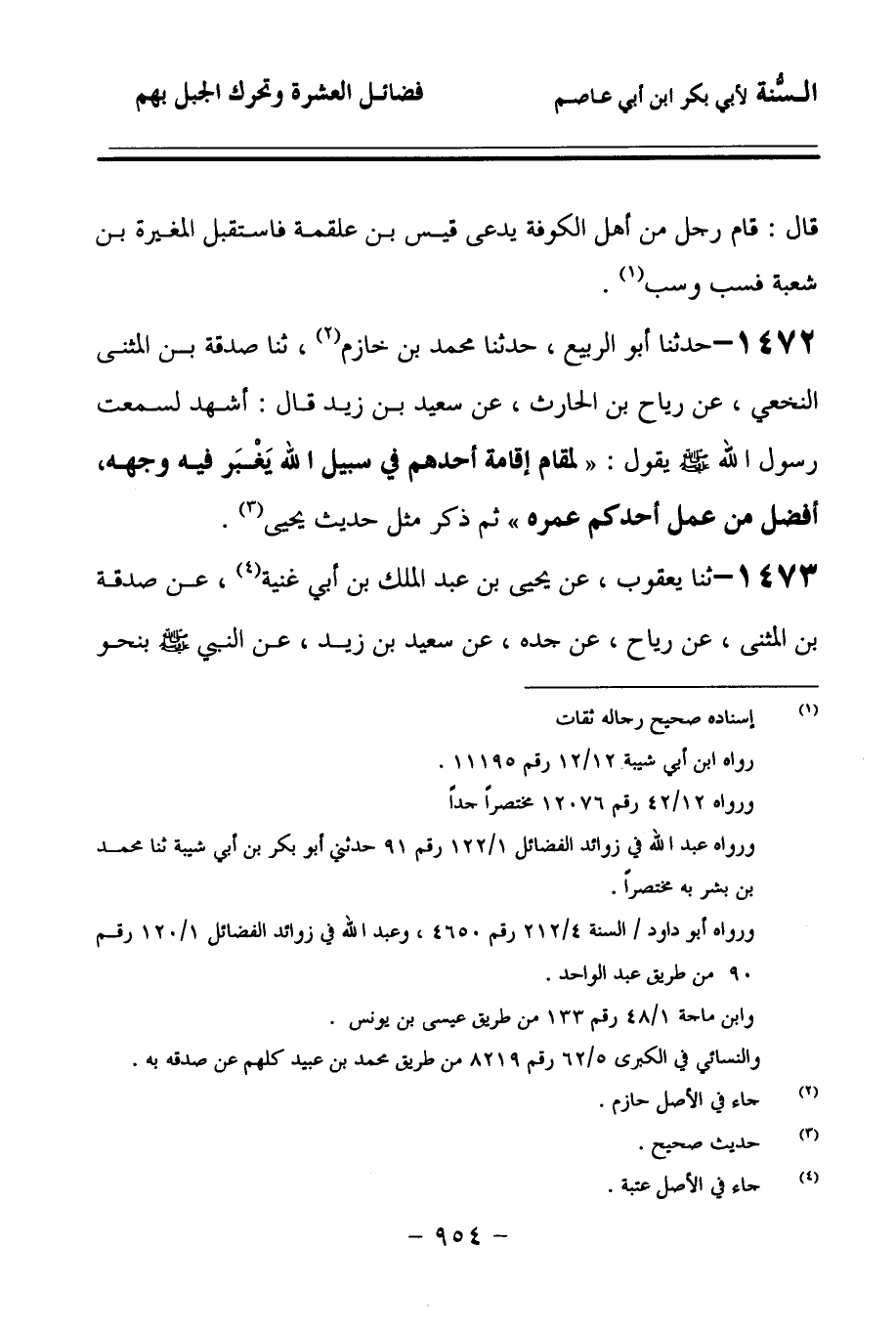 1472 - حَدَّثنا أَبُو الرَّبِيعِ، حَدَّثنا مُحَمَّدُ بْنُ خَازِمٍ، حَدَّثنا صَدَقَةُ بْنُ الْمُثَنَّى النَّخَعِيُّ, عَنْ رِيَاحِ بْنِ الْحَارِثِ, عَنْ سَعِيدِ بْنِ زَيْدٍ قَالَ: أَشْهَدُ لَسَمِعْتُ رَسُولَ اللهِ صَلى الله عَلَيهِ وسَلمَ يَقُولُ: لَمَقَامٌ أَقَامَهُ أَحَدُهُمْ فِي سَبِيلِ اللهِ يُغَبَّرُ فِيهِ وَجْهُهُ أَفْضَلُ مِنْ عَمَلِ أَحَدِكُمْ عُمْرَهُ، ثُمَّ ذَكَرَ مِثْلَ حَدِيثِ يَحْيَى.
