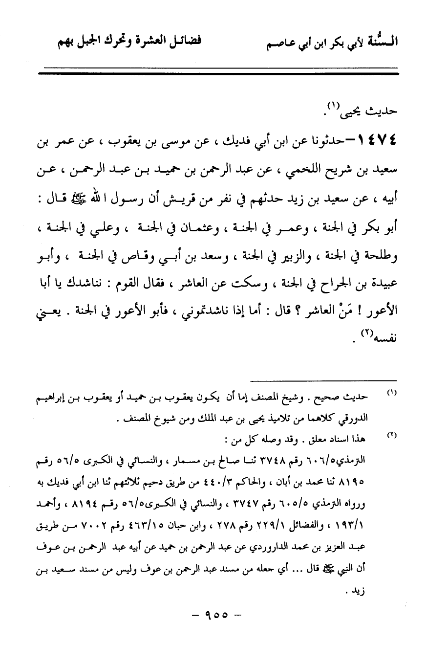 1474 - حَدَّثُونَا عَنِ ابْنِ أَبِي فُدَيْكٍ، عَنْ مُوسَى بْنِ يَعْقُوبَ، عَنْ عُمَرَ بْنِ سَعِيدِ بْنِ سُرَيْجٍ (1)، اللَّخْمِيِّ، عَنْ عَبْدِ الرَّحْمَنِ بْنِ حُمَيْدِ بْنِ عَبْدِ الرَّحْمَنِ، عَنْ أَبِيهِ، عَنْ سَعِيدِ بْنِ زَيْدٍ حَدَّثَهُمْ فِي نَفَرٍ مِنْ قُرَيْشٍ, أَنَّ رَسُولَ اللهِ صَلى الله عَلَيهِ وسَلمَ قَالَ: أَبُو بَكْرٍ فِي الْجَنَّةِ، وَعُمَرُ فِي الْجَنَّةِ، وَعُثْمَانُ فِي الْجَنَّةِ، وَعَلِيٌّ فِي الْجَنَّةِ، وَطَلْحَةُ فِي الْجَنَّةِ، وَالزُّبَيْرُ فِي الْجَنَّةِ، وَسَعْدُ بْنُ أَبِي وَقَّاصٍ فِي الْجَنَّةِ، وَأَبُو عُبَيْدَةَ بْنُ الْجَرَّاحِ فِي الْجَنَّةِ، وَسَكَتَ عَنِ الْعَاشِرِ، فَقَالَ الْقَوْمُ: نُنَاشِدُكَ يَا أَبَا الأَعْوَرِ مَنِ الْعَاشِرُ؟ قَالَ: أَمَا إِذَا نَاشَدْتُمُونِي، فَأَبُو الأَعْوَرِ فِي الْجَنَّةِ، يَعْنِي نَفْسَهُ.