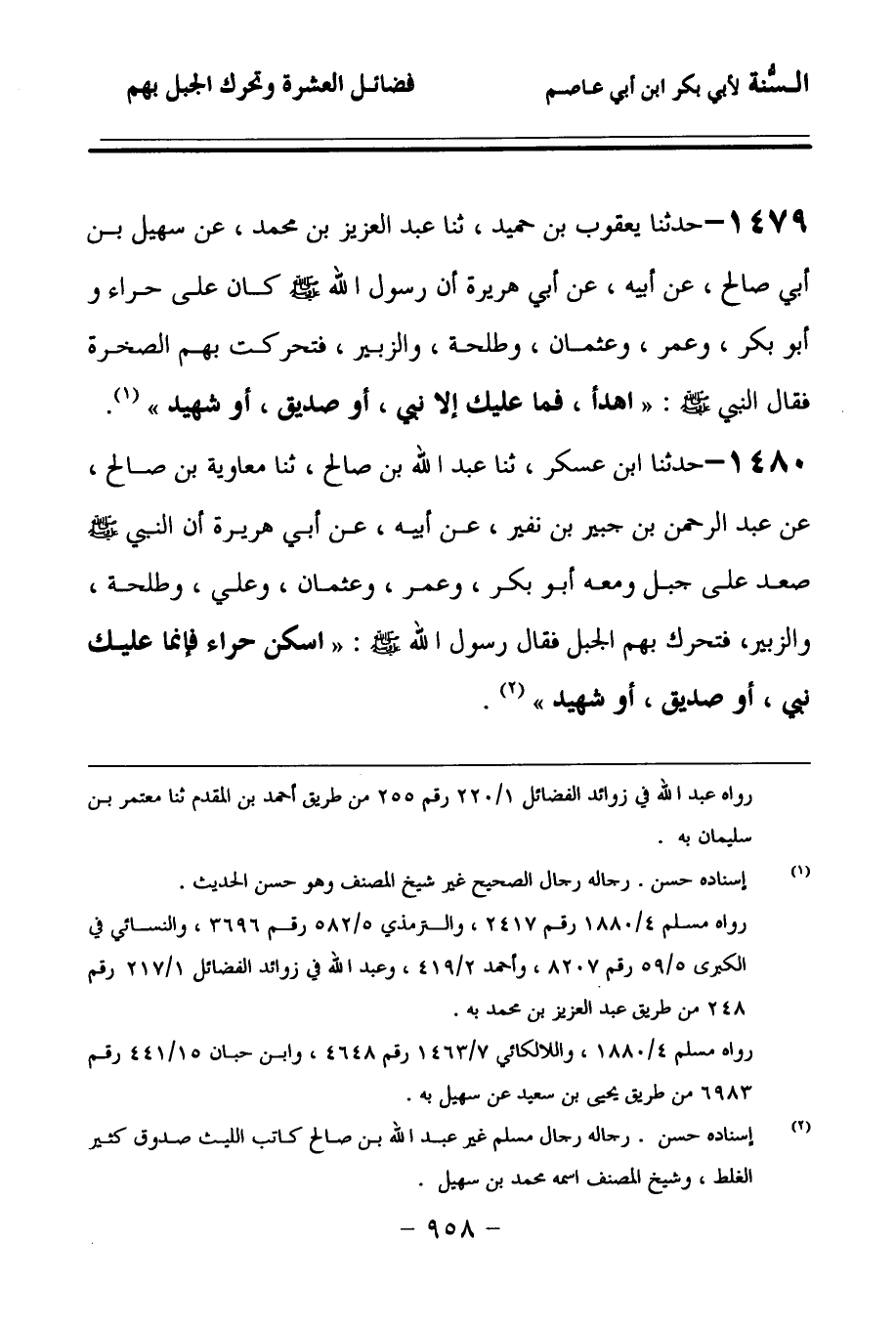 1480 - حَدَّثنا ابْنُ عَسْكَرٍ، حَدَّثنا عَبْدُ اللهِ بْنُ صَالِحٍ، حَدَّثنا مُعَاوِيَةَ بْنُ صَالِحٍ, عَنْ عَبْدِ الرَّحْمَنِ بْنِ جُبَيْرِ بْنِ نُفَيْرٍ، عَنْ أَبِيهِ، عَنْ أَبِي هُرَيْرَةَ، أَنَّ النَّبِيَّ صَلى الله عَلَيهِ وسَلمَ صَعِدَ عَلَى جَبَلٍ وَمَعَهُ أَبُو بَكْرٍ، وَعُمَرُ، وَعُثْمَانُ، وَعَلِيٌّ، وَطَلْحَةُ، وَالزُّبَيْرُ، فَتَحَرَّكَ بِهِمُ الْجَبَلُ، فَقَالَ رَسُولُ اللهِ صَلى الله عَلَيهِ وسَلمَ: اسْكُنْ حِرَاءُ, فَإِنَّمَا عَلَيْكَ نَبِيٌّ، أَوْ صِدِّيقٌ، أَوْ شَهِيدٌ.