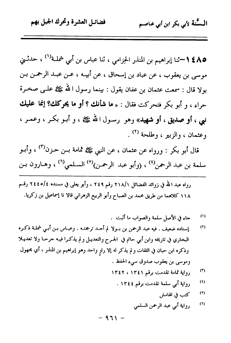 1485 - حَدَّثنا إِبْرَاهِيمُ بْنُ الْمُنْذِرِ الْحِزَامِيُّ، حَدَّثنا عَبَّاسُ بْنُ أَبِي شَمْلَةَ، حَدَّثَنِي مُوسَى بْنُ يَعْقُوبَ، عَنْ عَبَّادِ بْنِ إِسْحَاقَ، عَنْ أَبِيهِ، عَنْ عَبْدِ الرَّحْمَنِ بْنِ بُولاَ، قَالَ: سَمِعْتُ عُثْمَانَ بْنَ عَفَّانَ، يَقُولُ: بَيْنَمَا رَسُولُ اللهِ صَلى الله عَلَيهِ وسَلمَ عَلَى صَخْرَةِ حِرَاءٍ, وَأَبُو بَكْرٍ، فَتَحَرَّكَتْ، فَقَالَ: مَا شَأْنُكَ, أَوْ مَا يُحَرِّكُكَ، إِنَّمَا عَلَيْكَ نَبِيٌّ، أَوْ صِدِّيقٌ، أَوْ شَهِيدٌ؟ وَهُوَ رَسُولُ اللهِ صَلى الله عَلَيهِ وسَلمَ، وَأَبُو بَكْرٍ، وَعُمَرُ، وَعُثْمَانُ، وَالزُّبَيْرُ، وَطَلْحَةُ.
