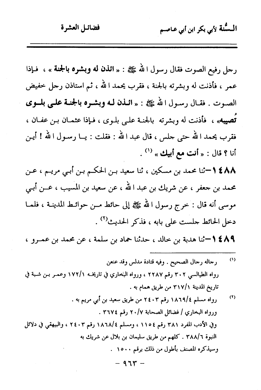 1488 - حَدَّثنا مُحَمَّدُ بْنُ مِسْكِينٍ، حَدَّثنا سَعِيدُ بْنُ الْحَكَمِ بْنِ أَبِي مَرْيَمَ، عَنْ مُحَمَّدِ بْنِ جَعْفَرٍ، عَنْ شَرِيكِ بْنِ عَبْدِ اللهِ، عَنْ سَعِيدِ بْنِ الْمُسَيِّبِ، عَنْ أَبِي مُوسَى، أَنَّهُ قَالَ: خَرَجَ رَسُولُ اللهِ صَلى الله عَلَيهِ وسَلمَ إِلَى حَائِطٍ مِنْ حَوَائِطِ الْمَدِينَةِ، فَلَمَّا دَخَلَ الْحَائِطَ جَلَسْتُ عَلَى بَابِهِ، فَذَكَرَ الْحَدِيثَ.