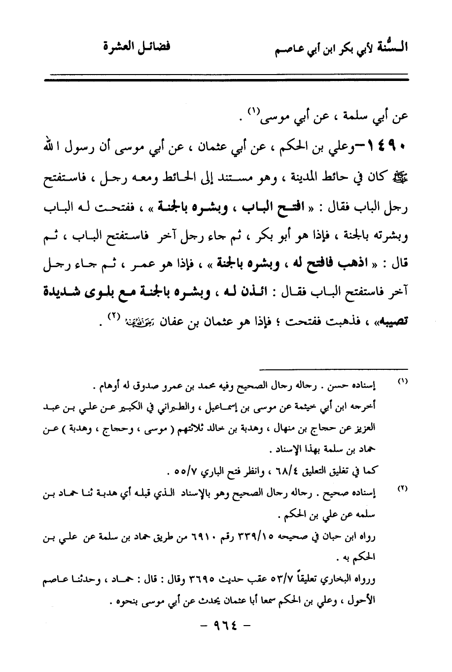 1490 - وَعَلِيُّ بْنُ الْحَكَمِ، عَنْ أَبِي عُثْمَانَ، عَنْ أَبِي مُوسَى، أَنَّ رَسُولَ اللهِ صَلى الله عَلَيهِ وسَلمَ كَانَ فِي حَائِطِ الْمَدِينَةِ، وَهُو مُسْتَنِدٌ إِلَى الْحَائِطِ, وَمَعَهُ رَجُلٌ، فَاسْتَفْتَحَ رَجُلٌ الْبَابَ، فَقَالَ: افْتَحِ الْبَابَ وَبَشِّرْهُ بِالْجَنَّةِ، فَفَتَحْتُ لَهُ الْبَابَ وَبَشَّرْتُهُ بِالْجَنَّةِ، فَإِذَا هُوَ أَبُو بَكْرٍ، ثُمَّ جَاءَ رَجُلٌ آخَرُ، فَاسْتَفْتَحَ الْبَابَ، ثُمَّ قَالَ: اذْهَبْ فَافْتَحْ لَهُ وَبَشِّرْهُ بِالْجَنَّةِ، فَإِذَا هُوَ عُمَرُ، ثُمَّ جَاءَ رَجُلٌ آخَرُ، فَاسْتَفْتَحَ الْبَابَ, فَقَالَ: ائْذَنْ لَهُ وَبَشِّرْهُ بِالْجَنَّةِ مَعَ بَلْوَى شَدِيدَةٍ تُصِيبُهُ، فَذَهَبْتُ فَفَتَحْتُ، فَإِذَا هُوَ عُثْمَانُ بْنُ عَفَّانَ رَضِيَ اللهُ عَنْهُ.