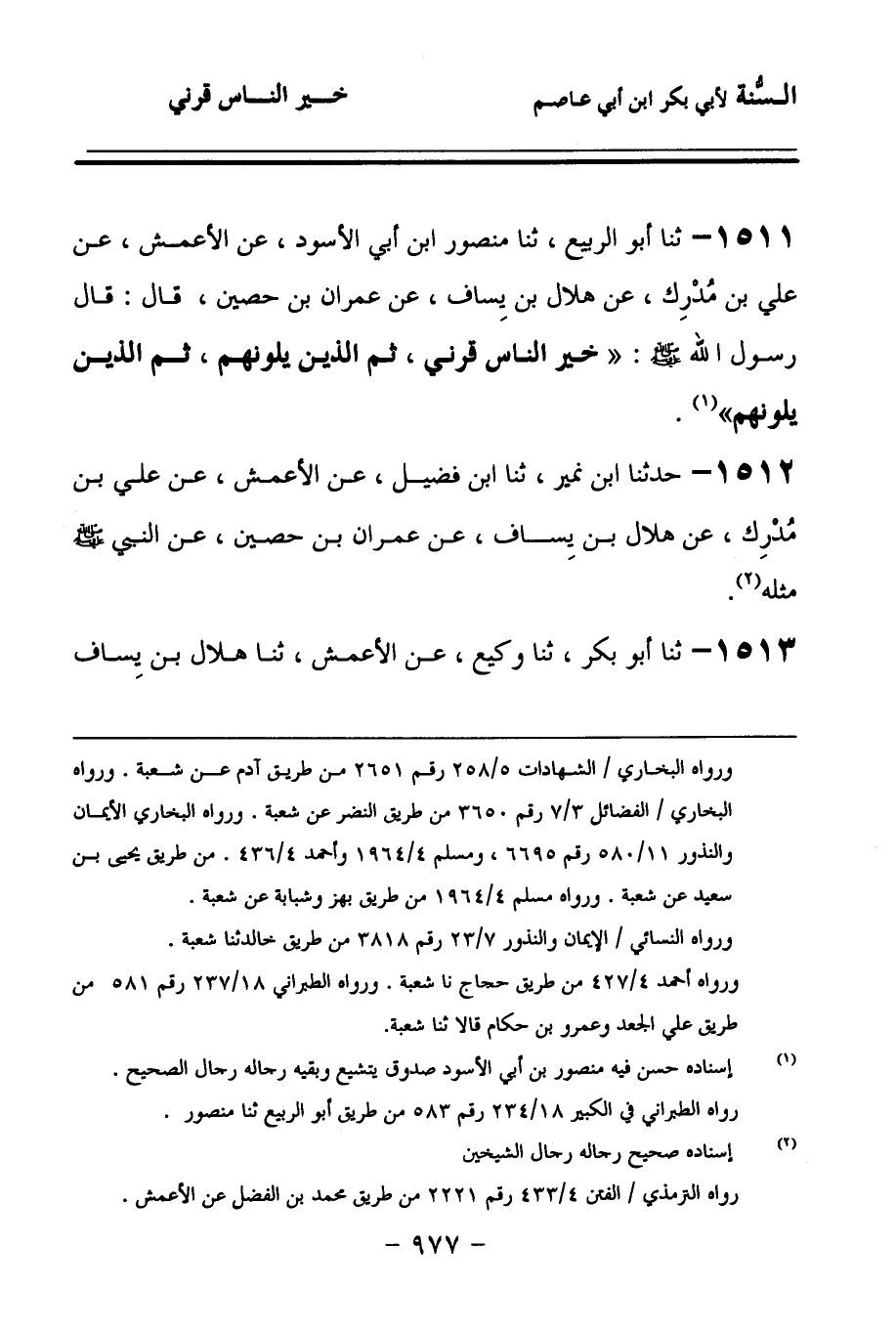 1513 - حَدَّثنا أَبُو بَكْرٍ، حَدَّثنا وَكِيعٌ، عَنِ الأَعْمَشِ، حَدَّثنا هِلاَلُ بْنُ يَسَافٍ، قَالَ: سَمِعْتُ عِمْرَانَ بْنَ حُصَيْنٍ يُحَدِّثُ قَالَ: قَالَ رَسُولُ اللهِ صَلى الله عَلَيهِ وسَلمَ: خَيْرُ النَّاسِ قَرْنِي، ثُمَّ الَّذِينَ يَلُونَهُمْ، ثُمَّ الَّذِينَ يَلُونَهُمْ.