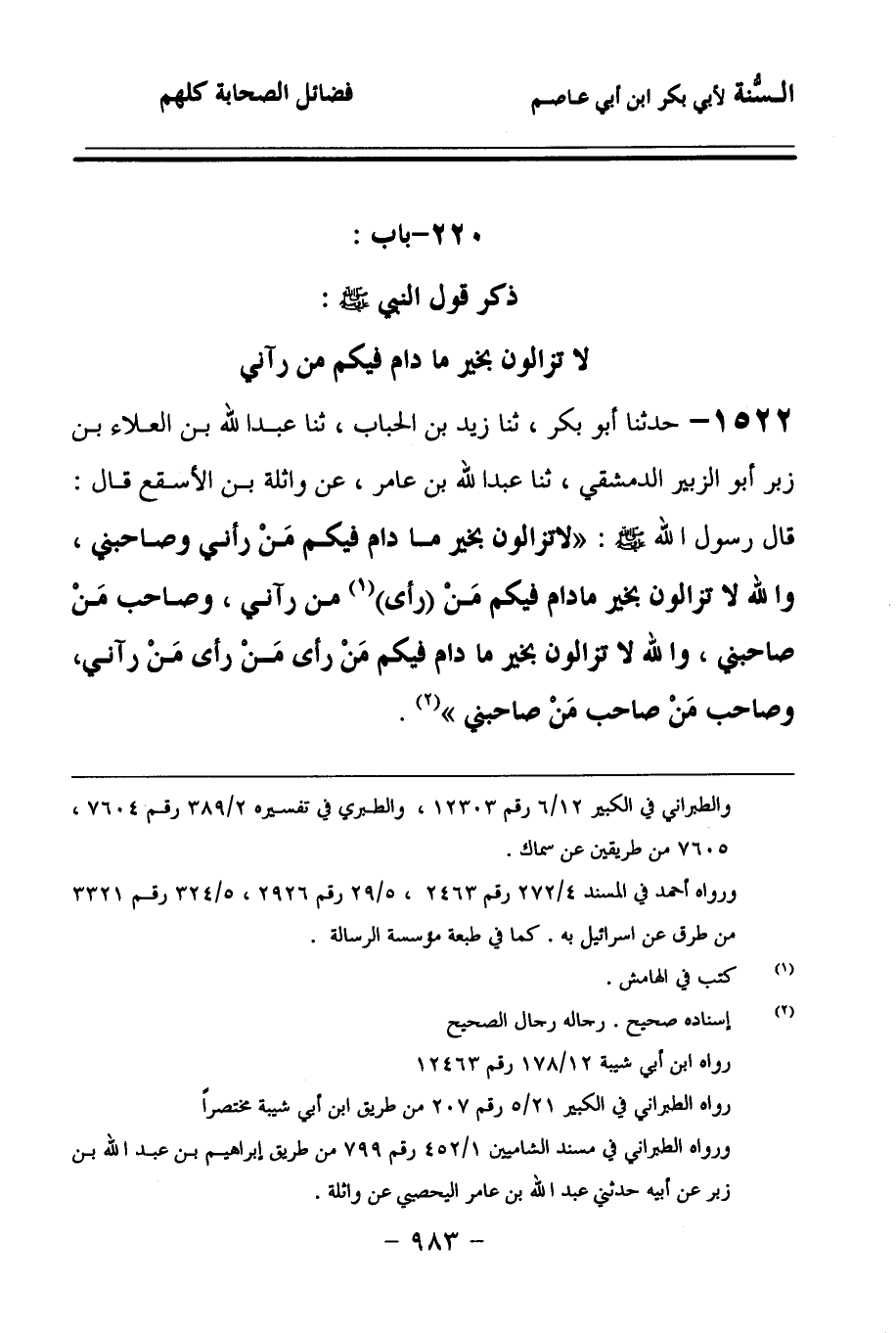 1522 - حَدَّثنا أَبُو بَكْرٍ، حَدَّثنا زَيْدُ بْنُ الْحُبَابِ، حَدَّثنا عَبْدُ اللهِ بْنُ الْعَلاَءِ بْنِ زَبْرٍ, أَبُو زَبْرٍ (1) الدِّمَشْقِيُّ، حَدَّثنا عَبْدُ اللهِ بْنُ عَامِرٍ، عَنْ وَاثِلَةَ بْنِ الأَسْقَع، قَالَ: قَالَ رَسُولُ اللهِ صَلى الله عَلَيهِ وسَلمَ: لاَ تَزَالُونَ بِخَيْرٍ مَا دَامَ فِيكُمْ مَنْ رَآنِي وَصَاحَبَنِي، وَاللهِ لاَ تَزَالُونَ بِخَيْرٍ مَا دَامَ فِيكُمْ مَنْ رَأَى مَنْ رَآنِي, وَصَاحَبَ مَنْ صَاحَبَنِي، وَاللهِ لاَ تَزَالُونَ بِخَيْرٍ مَا دَامَ فِيكُمْ مَنْ رَأَى مَنْ رَأَى مَنْ رَآنِي, وَصَاحَبَ مَنْ صَاحَبَ مَنْ صَاحَبَنِي.