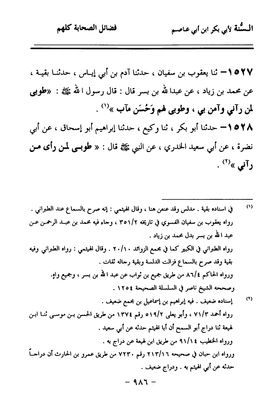 1527 - حَدَّثنا يَعْقُوبُ بْنُ سُفْيَانَ، حَدَّثنا آدَمُ بْنُ أَبِي إِيَاسٍ، حَدَّثنا بَقِيَّةُ، عَنْ مُحَمَّدِ بْنِ زِيَادٍ، عَنْ عَبْدِ اللهِ بْنِ بُسْرٍ، قَالَ: قَالَ رَسُولُ اللهِ صَلى الله عَلَيهِ وسَلمَ: طُوبَى لِمَنْ رَآنِي وَآمَنَ بِي، وَطُوبَى لَهُمْ وَحُسْنُ مَآبٍ.