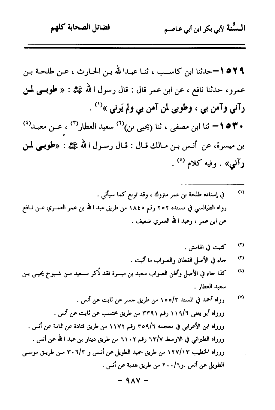1529 - حَدَّثنا ابْنُ كَاسِبٍ، حَدَّثنا عَبْدُ اللهِ بْنُ الْحَارِثِ، عَنْ طَلْحَةَ بْنِ عَمْرٍو، حَدَّثنا نَافِعٌ، عنِ ابْنِ عُمَرَ قَالَ: قَالَ رَسُولُ اللهِ صَلى الله عَلَيهِ وسَلمَ: طُوبَى لِمَنْ رَآنِي وَآمَنَ بِي، وَطُوبَى لِمَنْ آمَنَ بِي وَلَمْ يَرَنِي.