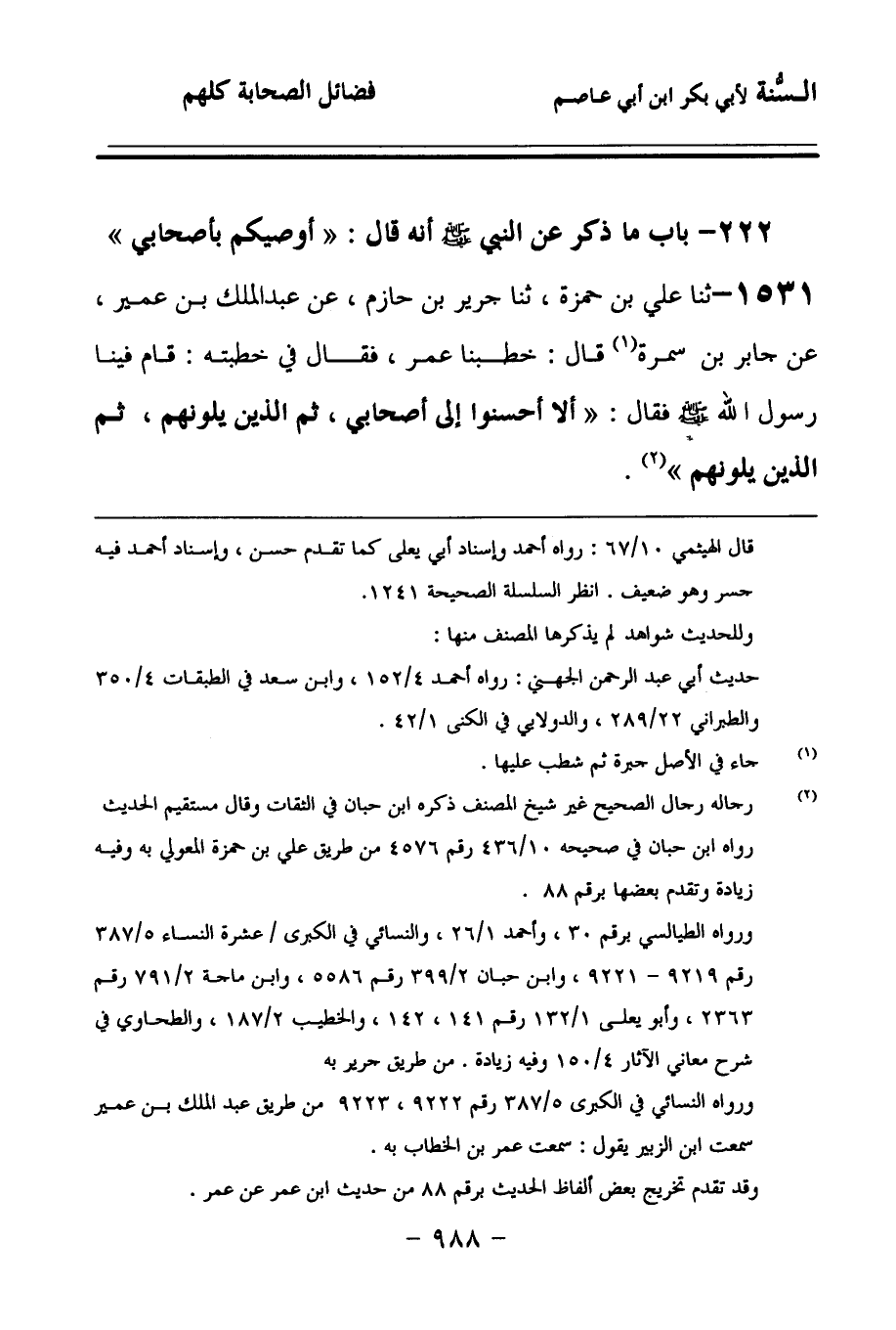 1531 - حَدَّثنا عَلِيُّ بْنُ حَمْزَةَ، حَدَّثنا جَرِيرُ بْنُ حَازِمٍ، عَنْ عَبْدِ الْمَلِكِ بْنِ عُمَيْرٍ، عَنْ جَابِرِ بْنِ سَمُرَةَ، قَالَ: خَطَبَنَا عُمَرُ, فَقَالَ فِي خُطْبَتِهِ: قَامَ فِينَا رَسُولُ اللهِ صَلى الله عَلَيهِ وسَلمَ فَقَالَ: أَلاَ أَحْسِنُوا إِلَى أَصْحَابِي، ثُمَّ الَّذِينَ يَلُونَهُمْ، ثُمَّ الَّذِينَ يَلُونَهُمْ.