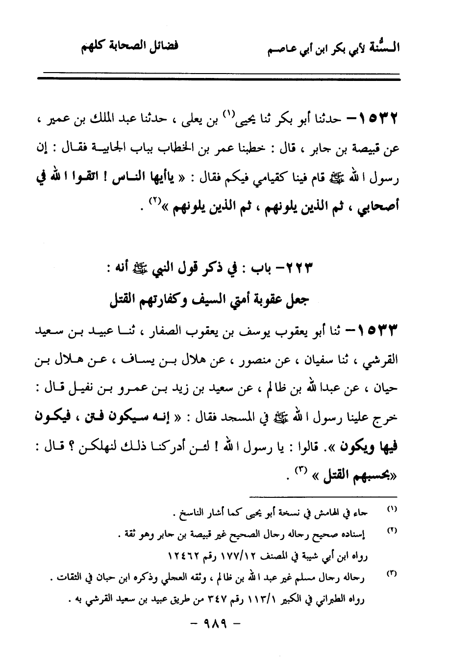 223 - بَابٌ فِي ذِكْرِ قَوْلِ النَّبِيِّ صَلى الله عَلَيهِ وسَلمَ أَنَّهُ جُعِلَ عُقُوبَةَ أُمَّتِي السَّيْفُ، وَكَفَّارَتَهُمُ الْقَتْلُ.