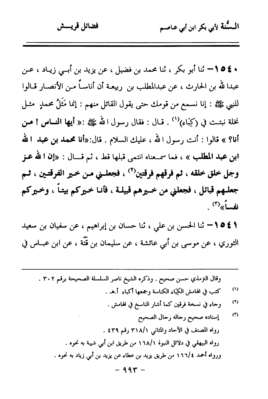 1540 - حَدَّثنا أَبُو بَكْرٍ، حَدَّثنا مُحَمَّدُ بْنُ فُضَيْلٍ، عَنْ يَزِيدَ بْنِ أَبِي زِيَادٍ، عَنْ عَبْدِ اللهِ بْنِ الْحَارِثِ، عَنْ عَبْدِ الْمُطَّلِبِ بْنِ رَبِيعَةَ، أَنَّ أُنَاسًا مِنَ الأَنْصَارِ قَالُوا لِلنَّبِيِّ صَلى الله عَلَيهِ وسَلمَ: إِنَّا نَسْمَعُ مِنْ قَوْمِكَ، حَتَّى يَقُولَ الْقَائِلُ مِنْهُمْ: إِنَّمَا مَثَلُ مُحَمَّدٍ مِثْلَ نَخْلَةٍ نَبَتَتْ فِي كِبَاءٍ، قَالَ: فَقَالَ رَسُولُ اللهِ صَلى الله عَلَيهِ وسَلمَ: أَيُّهَا النَّاسُ، مَنْ أَنَا؟ قَالُوا: أَنْتَ رَسُولُ اللهِ, عَلَيْكَ السَّلاَمُ، قَالَ: أَنَا مُحَمَّدُ بْنُ عَبْدِ اللهِ بْنِ عَبْدِ الْمُطَّلِبِ، فَمَا سَمِعْنَاهُ انْتَمَى قَبْلَهَا قَطُّ، ثُمَّ قَالَ: إِنَّ اللهَ عَزَّ وَجَلَّ خَلَقَ خَلْقَهُ، ثُمَّ فَرَقَهُمْ فِرْقَتَيْنِ، فَجَعَلَنِي مِنْ خَيْرِ الْفِرْقَتَيْنِ، ثُمَّ جَعَلَهُمْ قَبَائِلَ، فَجَعَلَنِي مِنْ خَيْرِهِمْ قَبِيلَةً، فَأَنَا خَيْرُكُمْ بَيْتًا، وَخَيْرُكُمْ نَفْسًا.