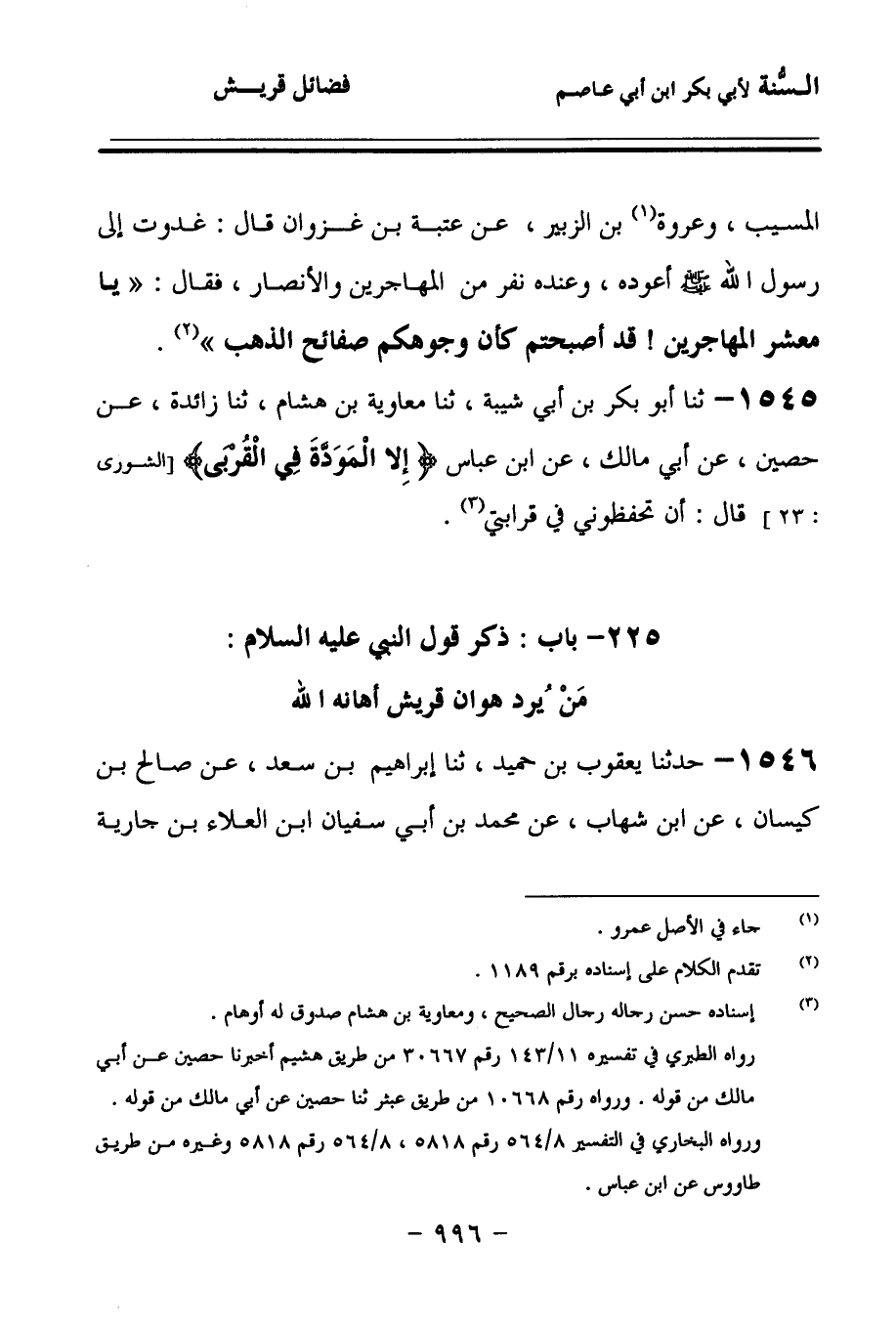 1545 - حَدَّثنا أَبُو بَكْرِ بْنُ أَبِي شَيْبَةَ، حَدَّثنا مُعَاوِيَةُ بْنُ هِشَامٍ، حَدَّثنا زَائِدَةُ، عَنْ حُصَيْنٍ، عَنْ أَبِي مَالِكٍ، عَنِ ابْنِ عَبَّاسٍ: {إِلاَّ الْمَوَدَّةَ فِي الْقُرْبَى} قَالَ: أَنْ تَحْفَظُونِي فِي قَرَابَتِي.