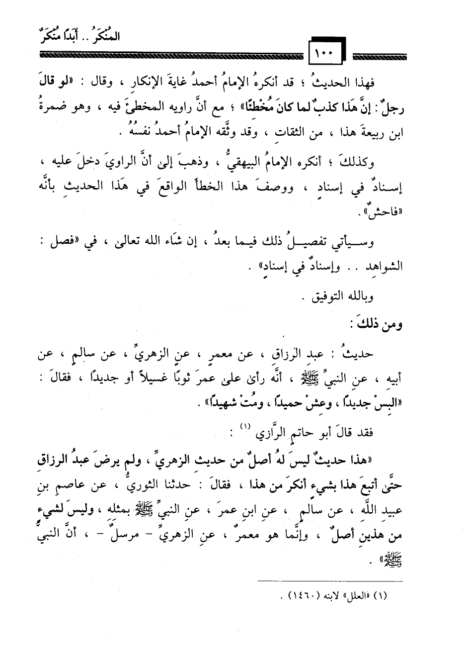 " هذا حديث ليس له أصل من حديث الزهري، ولم يرض عبد الرزاق حتى أبع هذا بشيء أنكر من هذا، فقال: حدثنا الثوري، عن عاصم بن عبيد الله، عن سالم، عن ابن عمر، عن النبي - صلى الله عليه وسلم - بمثله، وليس لشيء من هذين أصل، وإنما هو معمر، عن الزهري ـ