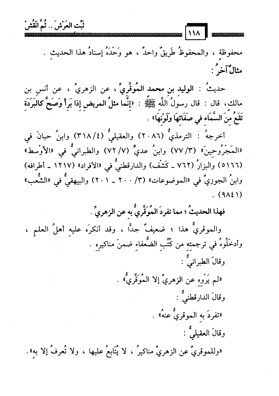 حديث: الوليد بن محمد الموقري، عن الزهري، عن أنس بن مالك، قال: قال رسول الله - صلى الله عليه وسلم -: " إنما مثل المريض إذا برأ وصح كالبردة تقع من السماء في صفائها ولونها ".