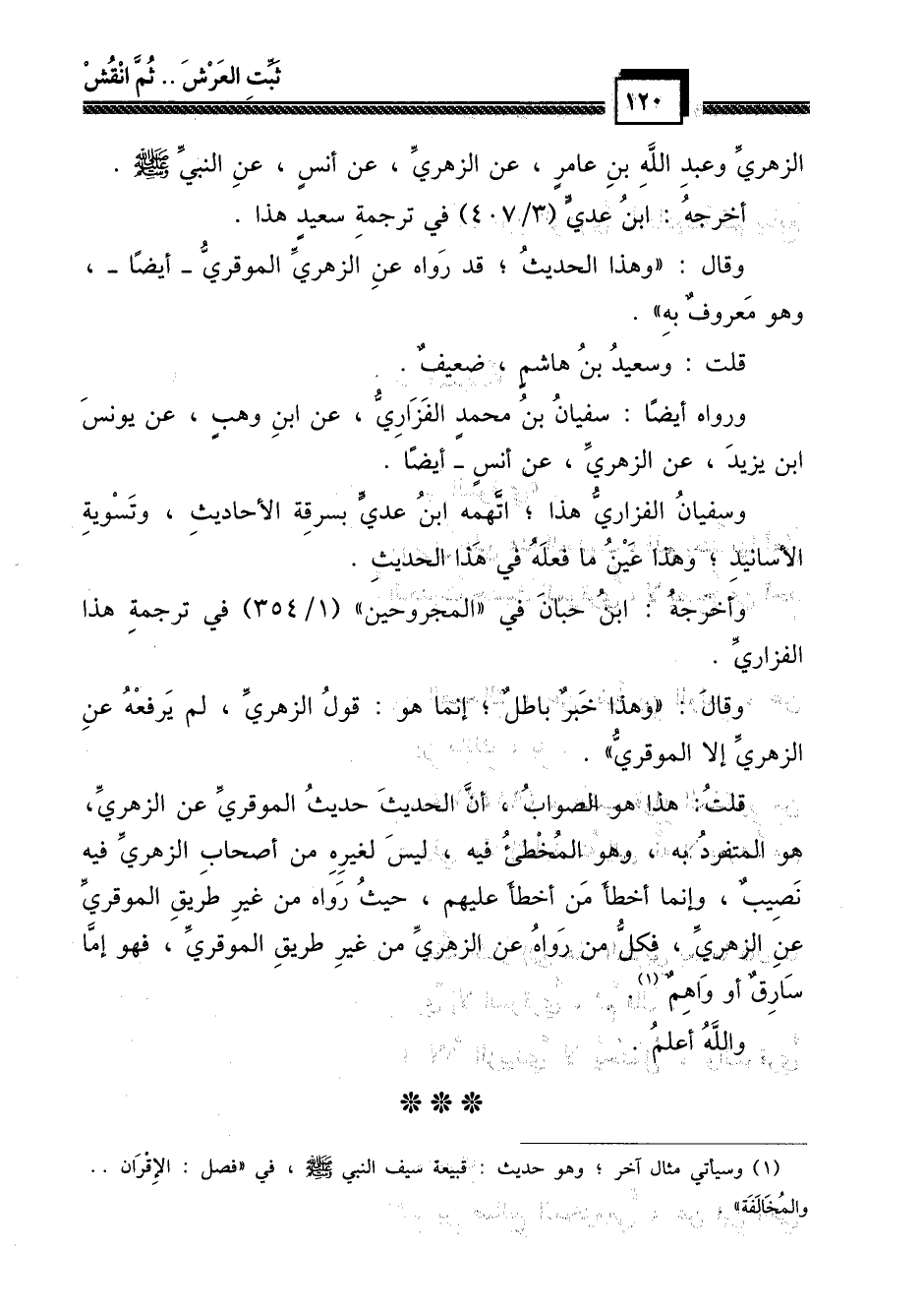 قلت: هذا هو الصواب، أن الحديث حديث الموقري عن الزهري، هو المتفرد به، وهو المخطئ فيه، ليس لغيره من أصحاب الزهري فيه نصيب، وإنما أخطأ من أخطأ عليهم، حيث رواه من غير طريق الموقري عن الزهري، فكل من رواه عن الزهري من غير طريق الموقري، فهو إما سارق أو واهم (¬1) .