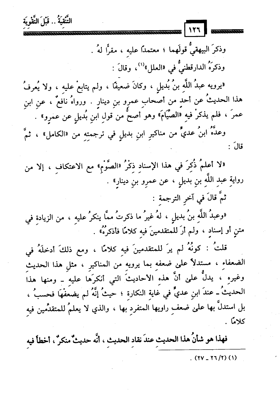 قلت: كونه لم ير للمتقدمين فيه كلاماً، ومع ذلك أدخله في الضعفاء، مستدلاً على ضعفه بما يرويه من المناكير، مثل هذا الحديث وغيره، يدل على أن هذه الأحاديث التي أنكرها عليه ـ ومنها هذا الحديث ـ عند ابن عدي في غاية النكارة؛ حيث إنه لم يضعفها فحسب، بل استدل بها على ضعف راويها المتفرد بها، والذي لا يعلم للمتقدمين فيه كلاماً.