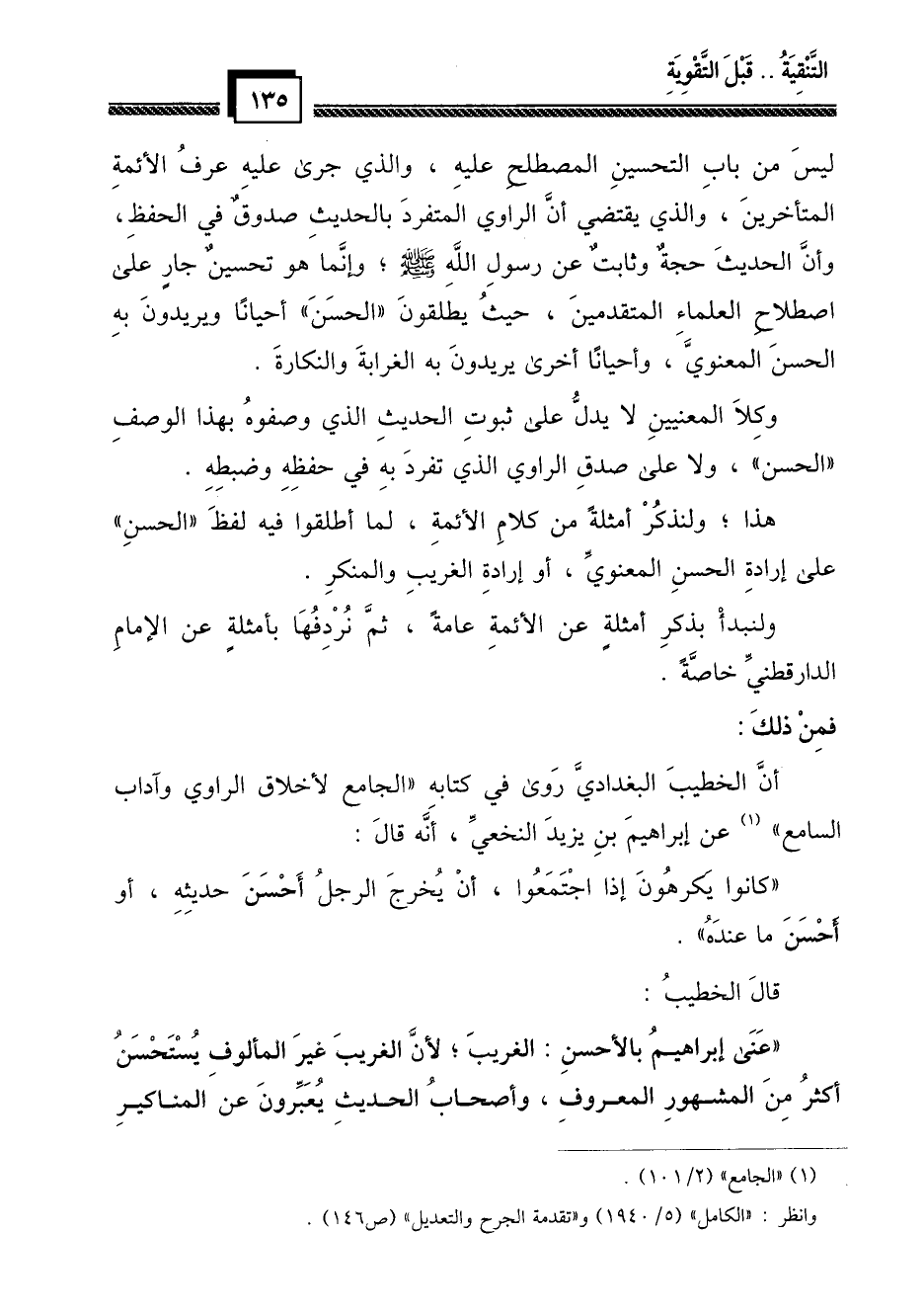 هذا؛ ولنذكر أمثلة من كلام الأئمة، لما أطلقوا فيه لفظ " الحسن " على إرادة الحسن المعنوي، أو إرادة الغريب والمنكر.
