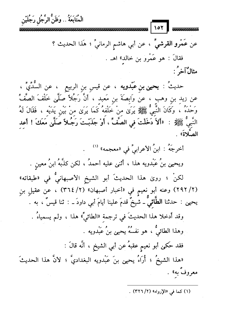 حديث: يحيى بن عبدويه، عن قيس بن الربيع، عن السدي، عن زيد بن وهب، عن وابصة بن معبد، أن رجلاً صلى خلف الصف وحده، وكان النبي - صلى الله عليه وسلم - يرى من خلفه كما يرى من بين يديه، فقال له النبي - صلى الله عليه وسلم -: "ألا دخلت في الصف، أو جذبت رجلاً صلى معك! أعد الصلاة ".