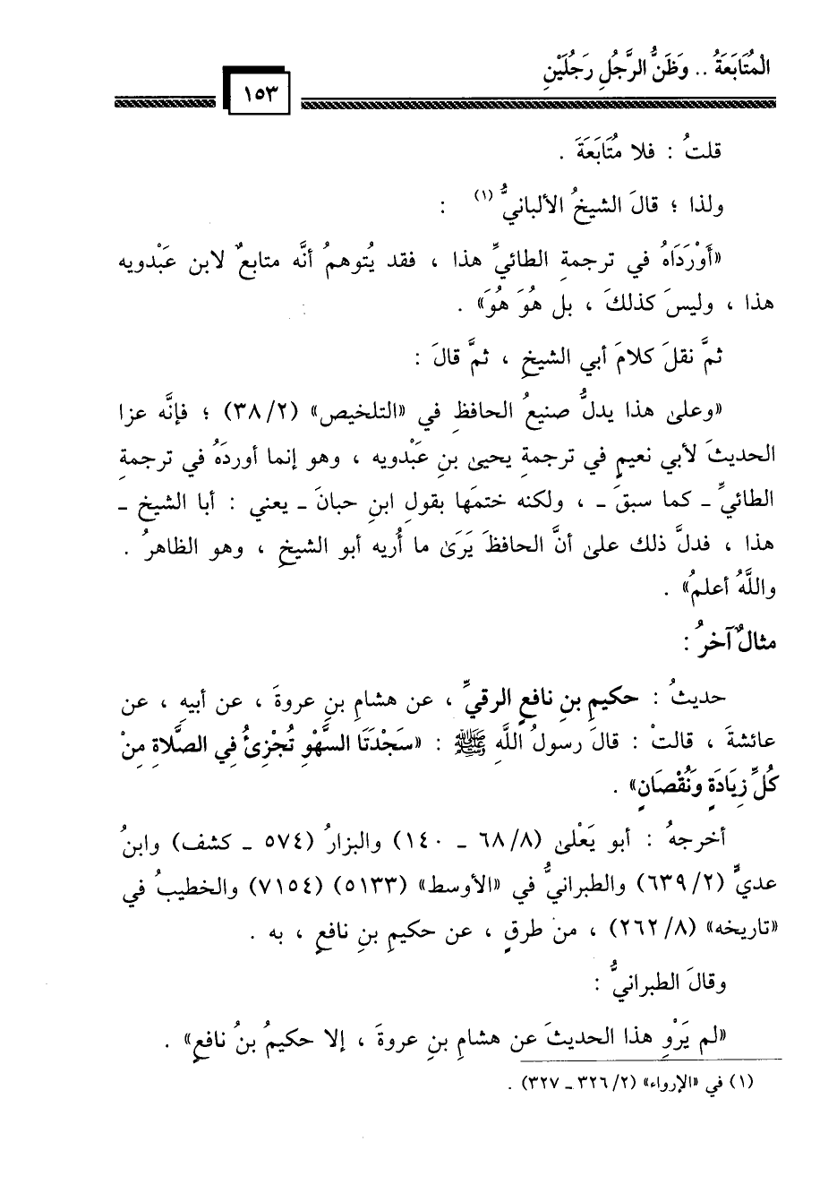 " وعلى هذا يدل صنيع الحافظ في " التلخيص " (2/37) ؛ فإنه عزا الحديث لأبي نعيم في ترجمة يحيى بن عبدويه، وهو إنما أورده في ترجمة الطائي ـ كما سبق ـ، ولكنه ختمها بقول ابن حبان ـ يعني: أبا الشيخ ـ هذا، فدل ذلك على أن الحافظ يرى ما أُريه أبو الشيخ، وهو الظاهر. والله أعلم ".
