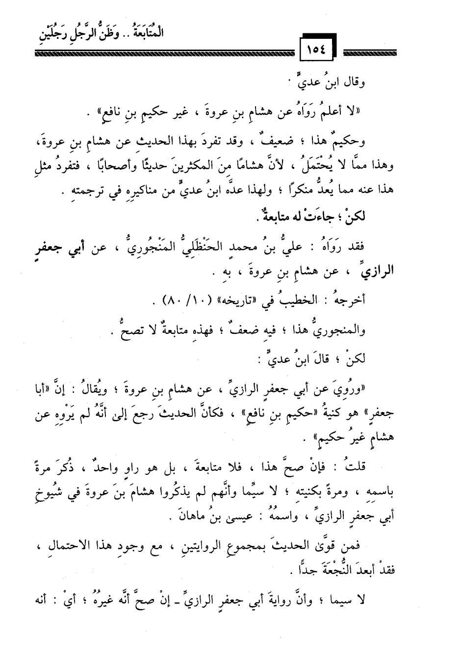 قلت: فإن صح هذا، فلا متابعة، بل هو راوٍ واحد، ذُكر مرة باسمه، ومرة بكنيته؛ لاسيما وأنهم لم يذكروا هشام بن عروة في شيوخ أبي جعفر الرازي، واسمه: عيسى بن ماهان.
