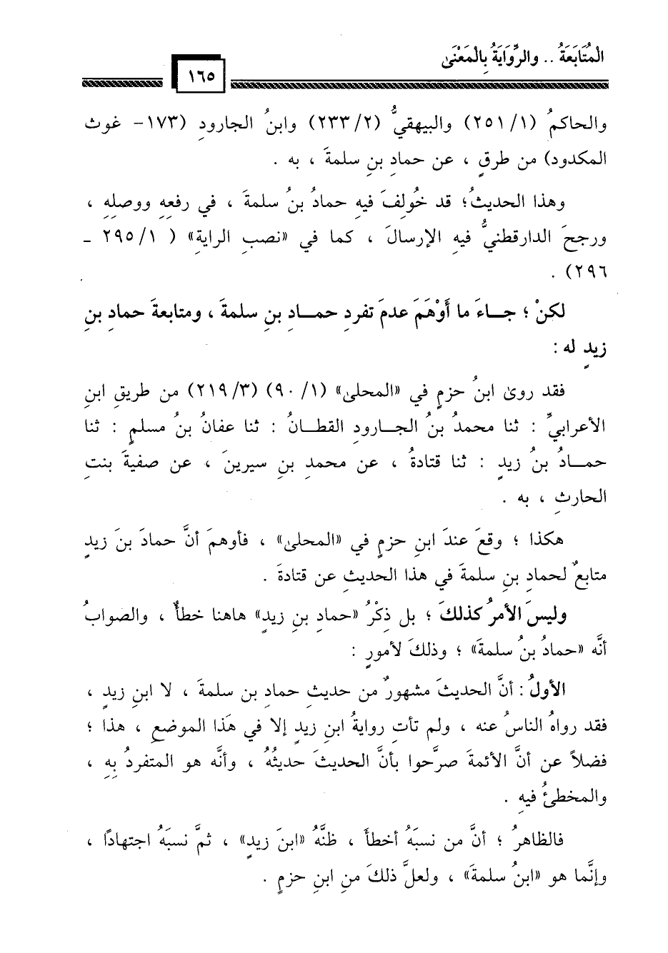 وليس الأمر كذلك؛ بل ذِكْر "حماد بن زيد " هاهنا خطأ، والصواب أنه حماد بن سلمة؛ وذلك لأمور: