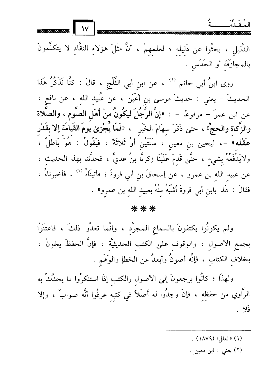 روى بن أبي حاتم (¬1) ، عن ابن أبي الثلج، قال: كنا نذكر هذا الحديث ـ يعني: حديث موسى بن أَعْين،