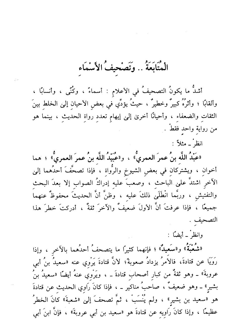 "شعبة" و "سعيد"؛ فإنهما كثيراً ما يتصحف أحدهما بالآخر، وإذا رويا عن قتادة، فلأمر يزداد صعوبة، لأن قتادة يروي عنه "سعيد بن أبي عروبة" ـ وهو ثقة من كبار أصحاب قتادة ـ، ويروي عنه أيضاً " سعيد بن بشير" ـ وهو ضعيف، صاحب مناكير ـ، فإذا كان راوي الحديث عن قتادة هو "سعيد بن بشير"، ولم يُنسب، ثم تصحف إلى "شعبة" كان الخطر عظيماً، وإذا كان راويه عن قتادة هو "سعيد بن أبي عروبة"، فإن ابن أبي