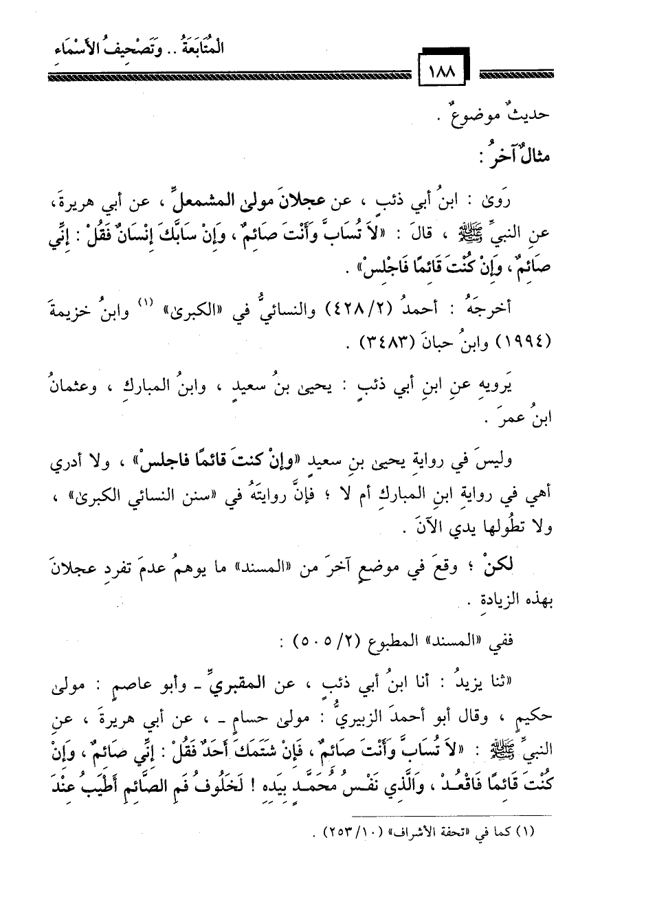 روى: ابن أبي ذئب، عن عجلان بن المشمعل، عن أبي هريرة، عن النبي - صلى الله عليه وسلم -، قال: "لا تساب وأنت صائم، وإن سابك إنسان فقل: إني صائم، وإن كنت قائماً فاجلس".