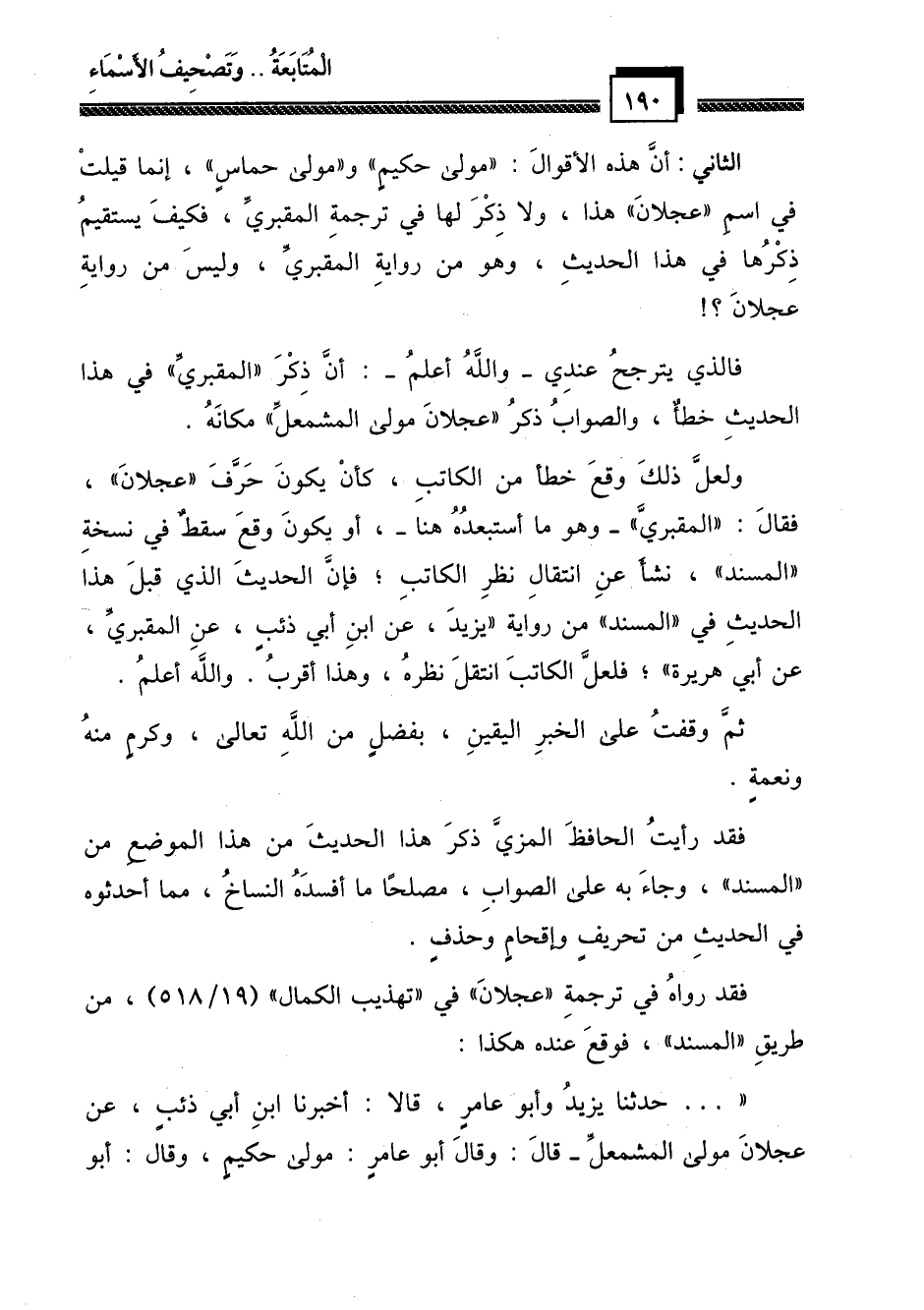 الثاني: أن هذه الأقوال: "مولى حكيم" و "مولى حماس"، إنما قيلت في اسم "عجلان" هذا، ولا ذكر لها في ترجمة المقبري، فكيف يستقيم ذكرها في هذا الحديث، وهو من رواية المقبري، وليس من رواية عجلان؟!