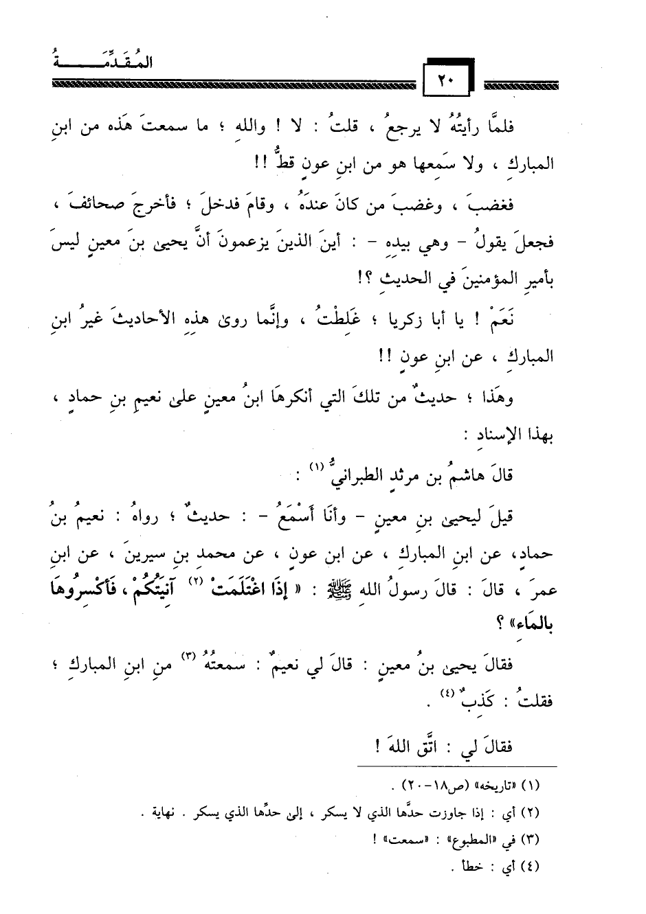 فلما رأيته لا يرجع، قلت: لا! والله؛ ما سمعت هذه من ابن المبارك، ولا سمعها هو من ابن عون قط! فغضب، وغضب من كان عنده، وقام فدخ؛ فأخرج صحائف، فجعل يقول ـ وهي بيده ـ أين الذين يزعمون أن يحيى بن معين ليس بأمير المؤمنين في الحديث؟ !