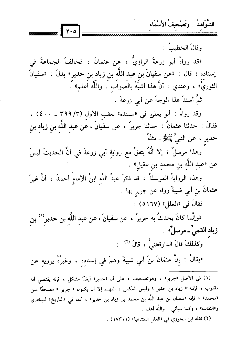 "قد رواه أبو زرعة الرازي، عن عثمان، فخالف الجماعة في إسناده؛ قال: "عن سفيان بن عبد الله بن زياد بن حدير" بدل: "سفيان الثوري"، وعندي: أن هذا أشبه بالصواب. والله أعلم.