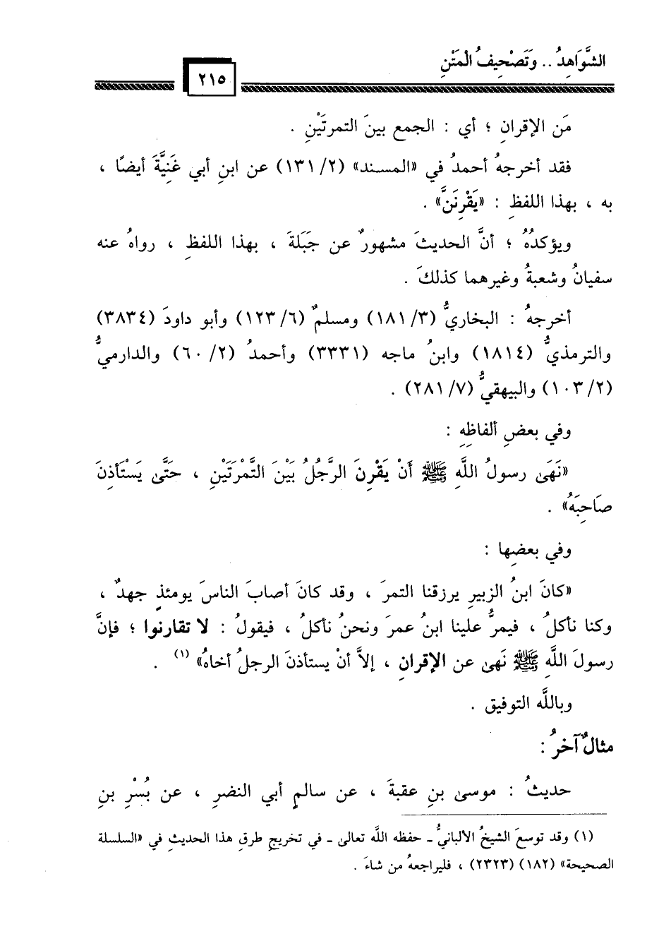 وفي بعض ألفاظه: " نهى رسول الله - صلى الله عليه وسلم - أن يقرن الرجل بين التمرتين، حتى يستأذن صاحبه ".