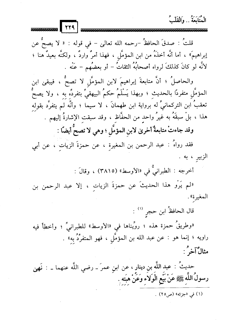 قلت: صدق الحافظ ـ رحمه الله تعالى ـ في قوله: " لا يصح عن إبراهيم "، أما أنه أخذه من ابن المؤمل، فهذا أمر وارد، ولكنه بعيد هنا؛ لأنه لو كان كذلك لرواه أصحابه الثقات ـ أو بعضهم ـ عنه.