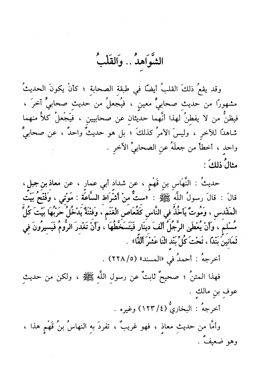 حديث: النهاس بن قهم، عن شداد أبي عمار، عن معاذ، قال: قال رسول الله - صلى الله عليه وسلم -: " ست من أشراط الساعة: موتي، وفتح بيت المقدس، وموت يأخذ في الناس كقعاص الغنم، وفتنة يدخل حربها بيت كل مسلم، وأن يُعطى الرجل الألف دينار فيتسخطها، وأن تغدر الروم فيسيرون في ثمانين بنداً، تحت كل بند اثنا